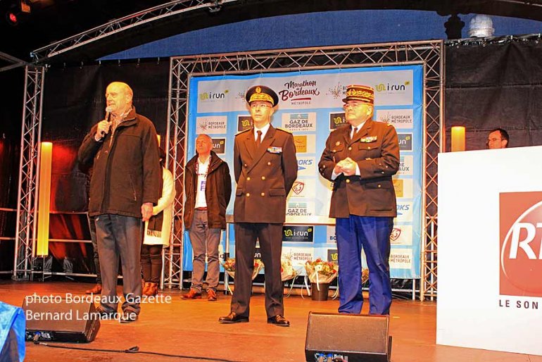 Encore sous le coup de l’émotion du décès du Lieutenant-Colonel de 44 ans Arnaud Beltrame, Alain Juppé, président de Bordeaux Métropole a voulu souligner l’énorme travail de sécurité réalisé pour protéger ce marathon nocturne, travail de sécurité réalisé conjointement par les services de la préfecture et la gendarmerie afin qu’aucune ombre ne plane sur cette manifestation sportive et festive qui a attiré pas loin de cent mille personnes sur les quais pour le départ du semi-marathon, du marathon et du marathon relais donné quelques minutes après vingt heures après que la sécurité ait donné son feu vert. Une minute de silence à la mémoire des victimes de cet attentat et particulièrement d’Arnaud Beltrame a été scrupuleusement respectée tranchant sur le joyeux tintamarre qui précédait le départ. Renaud Beltrame était promis à une grande carrière car en langage populaire c’était "une pointure" major de l’école de Saint-Cyr Coëtquidan avec un sens profond du service dû à la nation et à ses concitoyens, doté d’une grande empathie, il faisait preuve de respect et d’humilité dans sa fonction. C’est parce qu’il était aussi un grand sportif qu’Alain Juppé a fait cette dédicace.