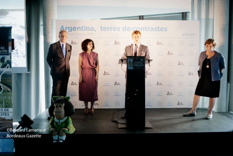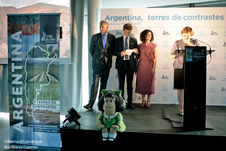 Déjà ouverte au public depuis le 12 août la superbe et très parlante exposition "Argentina, terre de contrastes" a été officiellement inaugurée en présence de Gabriela Ricardes, Secrétaire d’État en charge des Contenus au sein du Système fédéral des Médias et des Contenus Publics d’Argentine, de Monsieur l’Ambassadeur en France de la République d’Argentine Mario Raùl Veron Guerra, de Sylvie Cazes, Présidente de la Fondation de la Cité du Vin et de Nicolas Forian, maire de Bordeaux. Après la visite, comme à l’accoutumé les personnalités se sont exprimées pour remercier les acteurs de la mise en place de cette exposition qui flatte l’Argentine et sa production viticole. La mise en évidence des liens qui unissent la France et l’Argentine ont été largement décrits et Nicolas Florian particulièrement en forme s’est laissé aller à quelques formules savoureuses comme le moment où il a prié l’Argentine d’excuser la France de l’avoir battu en Coupe du Monde de football, tout en voulant bien considérer qu’elle avait été battue par l’équipe championne du Monde. On a senti le maire fasciné par ce pays qu’il n’a jamais visité et il n’a pas caché son intention de s’y rendre à l’occasion, il s’est dit totalement séduit. Après les discours une dégustation de vins argentins a eu lieu accompagné de quelques bouchées friandes pour mieux apprécier les nectars blancs et rouges proposés. Une surprise attendait les participants car à 20 heures tout le monde a été prié de rejoindre l’amphithéâtre Jefferson où l’artiste argentin Jairo a offert un concert d’une quarantaine de minutes