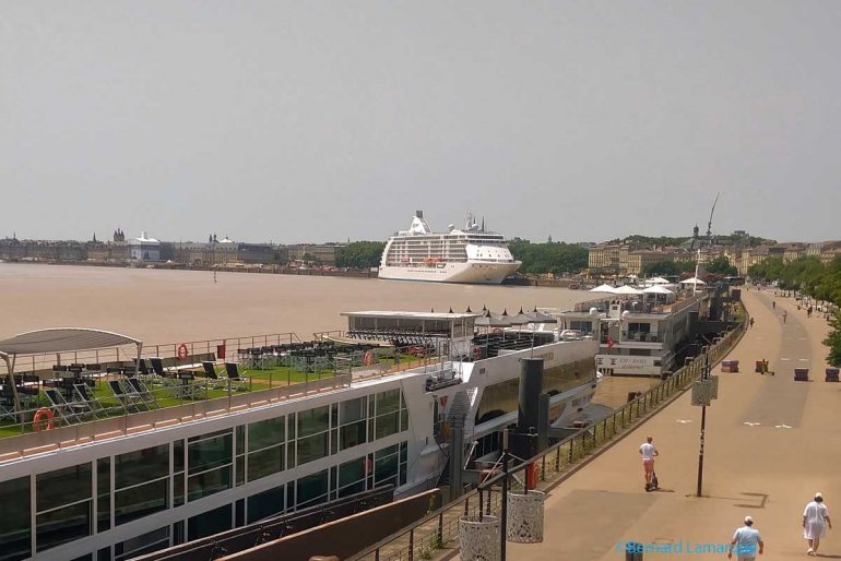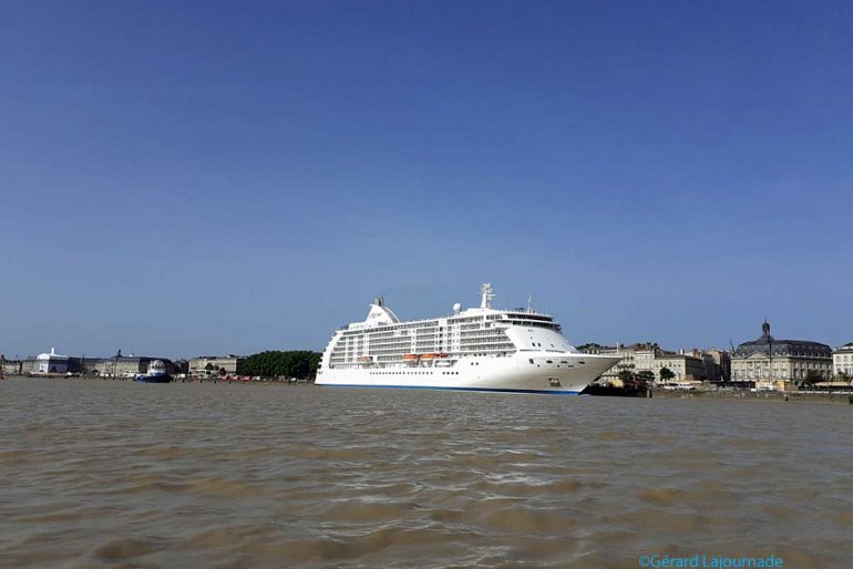 Pendant l’escale de ce dernier les croisiéristes voulant visiter Bordeaux ont du se frayer un chemin à travers les préparatifs de Bordeaux Fête le Vin pour rejoindre le centre ville. Les quais sont plus ou moins fermés encore pour l’instant mais dès jeudi le périmètre sera clos et il faudra un viatique pour pénétrer sur le site. Le Seven Seas Voyagers est reparti sans avoir égaré personne, il s’agissait d’une croisière longue durée de 27 jours au départ de Barcelone qui pour venir à Bordeaux a fait le tour de l’Espagne avec un passage à Palma de Majorque puis en franchissant le détroit de Gibraltar après avoir touché Malaga pour une escale. Une fois le détroit franchi il a fait une petite escapade sur Casablanca puis retour sur Cadiz en Espagne puis Lisbonne avec passage obligé à Bilbao qui est une escale très fréquentée comme du reste Bordeaux qui sur ce voyage n’est qu’une des quatre escales françaises avec Lorient, Brest ou il fait escale ce jour et Honfleur. Le terminus de la croisière est prévu à Belfast en Irlande du Nord ou il sera le 3 juillet et d’ici là il va se rendre en divers point d’Angleterre et d’Irlande. Il peut transporter jusqu’à un peu plus de 700 passagers dans des conditions de luxe et de confort remarquables. Il appartient à la Regent Seven Seas Cruises et navigue sous pavillon des Bahamas.