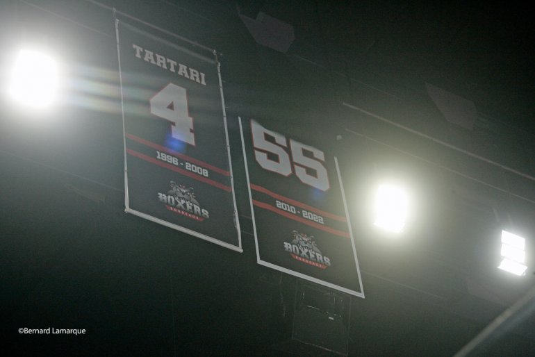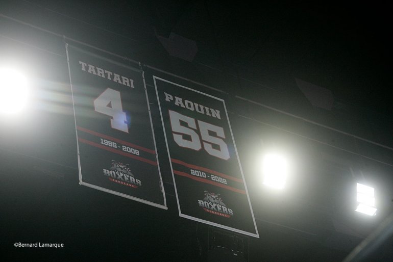 C’est une patinoire pleine qui a assisté a l’accrochage du numéro 55 en haut de la patinoire à coté de celui de Stéphane Tartari. L’accrochage d’un maillot consiste à mettre de côté le numéro porté par un joueur après sa retraite(voire son décès) en hommage à sa contribution au club. Ce numéro ne sera plus jamais porté par aucun joueur dans le club, ce numéro c’est celui de François Paquin qui a consacré 12 ans de sa vie aux Boxers et qui continue en étant entraineur des U20, U17 et U13, c’est aujourd’hui le plus bordelais des Québécois. Sous l’impulsion de Stéphane Tartari le club grandi et se structure avec maintenant l’appoint de François Paquin qui a fait souche à Bordeaux son titre de gloire, le plus marquant reste de celui de capitaine de l’équipe qui a accédé à la Lige Magnus et qui depuis n’a jamais quitté le haut niveau. François Paquin a raccroché les patins en championnat à la fin de la saison passée mais de part son activité, il reste très présent au club. Vous trouverez sous la plume de Claude Canellas un très intéressant portrait de François Paquin ICI