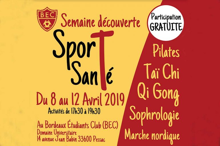 Du lundi 8 avril au vendredi 12 avril le BEC propose une semaine découverte Sport Santé Gratuite au Domaine Universitaire 14, avenue Jean Babin 33600 PESSAC