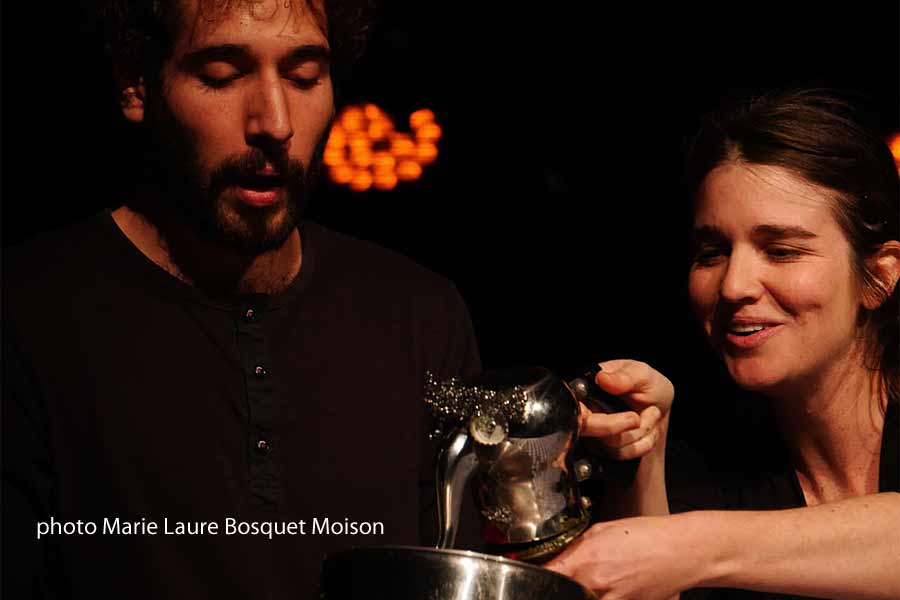 Dans la peau d’un professeur universitaire acariâtre et désabusé malmené par la technologie, il nous a distillé ses connaissances (authentiques) sur le dramaturge. Un moment à la fois pédagogique et très drôle. Sur un tout autre registre c’est la compagnie « La naine rouge » qui nous a présenté une évocation tout à fait inhabituelle et originale d’ « Ubu Roi » d’Alfred Jarry. « La soupe à la conspiration » pour le coup portait bien son nom puisque des ustensiles de cuisine détournés de leurs fonctions habituelles figuraient entre autres les personnages du père et de la mère Ubu. Ils ont interprété avec un enthousiasme et un brio étonnant épicé à la sauce contemporaine cette histoire parfaitement folle. Margaux Boisserand et Antoine Tissandier étaient les acteurs créateurs assistés par Kevin Jouan pour la mise en scène.
