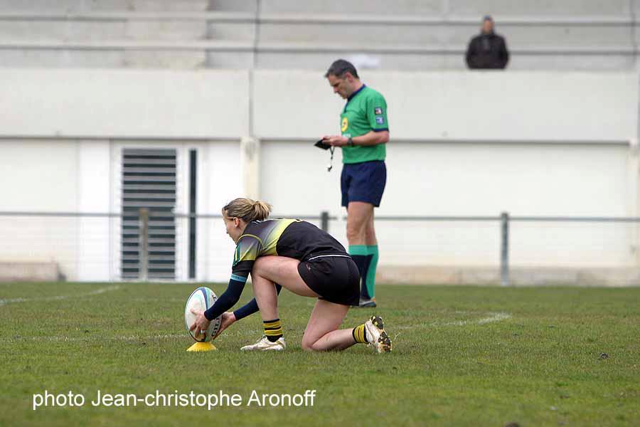 Les lionnes l’avaient emporté sur le score de 20 à 6 avec le bonus offensif. L’effectif du Stade Bordelais est un peu remanié à cause des blessures et de la volonté du club de laisser aux baby lionnes toutes les chances de remporter la demi finale de secteur qualificative pour le quart de finale du championnat de France de fédérale 3. Malgré ces difficultés l’équipe alignée a fière allure et réalise une très bonne entame en ouvrant le score dès la deuxième minute sur une pénalité de Lagougine. Une maladresse sur la réception du coup d’envoi permet à la botteuse de Rennes d’égaliser. C’est le début de la course poursuite entre les deux équipes. Les bordelaises dominent leur sujet notamment sur des ballons portés qui mettent en difficulté leurs adversaires. Ces efforts ne sont pas récompensés avec des fautes non sanctionnées et un manque de précision dans la finition. C’est un peu contre le cours du jeu que les rouge et noires inscrivent le premier essai de la rencontre suite à une touche et une succession de temps de jeu. Guenaëlle MAHE plonge dans l’en but bien servie par CORSON qui casse le placage de MORICE. La réaction bordelaise est immédiate avec un essai collectif suite à une pénalité à la main jouée près de la ligne adverse. Le travail de force paie enfin et les avants valident cette période de domination. 10 à 10 après 26 minutes de jeu. C’est Rennes qui aura le dernier mot dans cette première mi-temps en inscrivant un essai par Jade LE PESCQ la jeune internationale. Suite à une mêlée tournée, un peu plus que la règle ne le permet, une belle combinaison est initiée par Lucie CANAL relayée par sa capitaine Anne BERVILLE qui décale son arrière lancée à pleine vitesse qui d’un crochet dépose le dernier rempart bordelais.