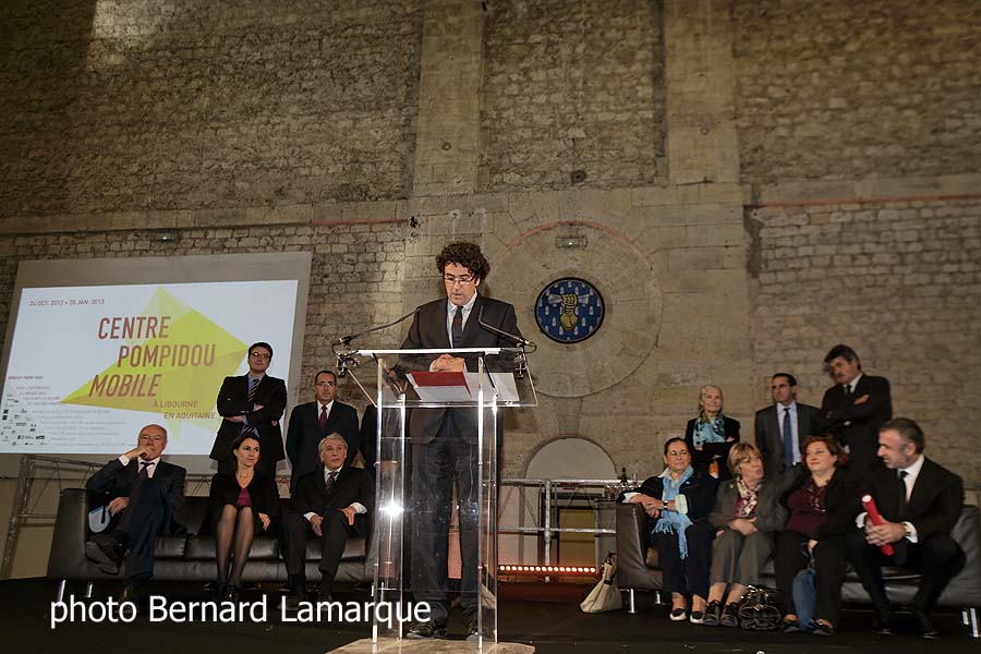 En place depuis déjà 3 semaines à Libourne il a battu tous les records de fréquentation avec plus de 20.000 visiteurs. Le centre Pompidou Mobile est né de la volonté de porter la culture dans les régions surtout dans des domaines comme l’art moderne et contemporain. Installé quartier Lamarque, dans la cour de l’ancienne caserne du 15ème Régiment de Dragons (1688 – 1945), c’est dans l’extraordinaire salle du manège qu’ont eu lieu discours et réception en présence de la Ministre Aurélie Filippetti et du Président du Centre Pompidou, Alain Seban.