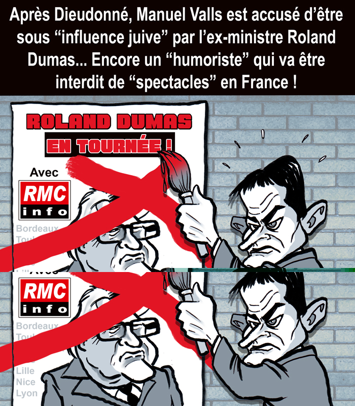 Après Dieudonné, Manuel Valls est accusé d’être sous "influence juive" par l’ex-ministre Roland Dumas... Encore un "humoriste" qui va être interdit de "spectacles" en France !