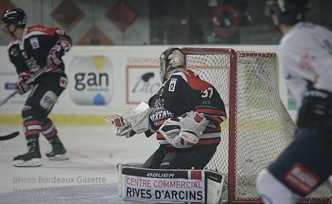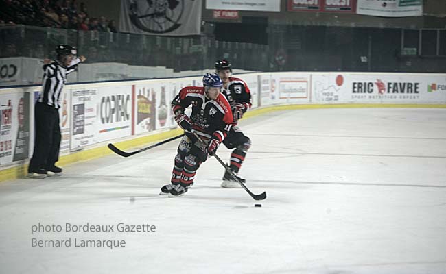 Le troisième tiers continue sur un rythme bien lent et finalement les Chamois se réveillent et reviennent au score (2-1 à 43’43). On espère que cela va sortir les Bordelais de leur torpeur mais non, ils n’y sont plus, pire, Tarantino donne bêtement une supériorité à Chamonix qui ne se prive pas (2-2 à 48’19). Ce dernier se rattrape de la plus belle des façons en glissant le palet entre les jambes du gardien (3-2 à 50’14). Malheureusement la joie ne sera que de courte durée et les Chamois égalisent sur une déviation d’un joueur laissé bien seul par la défense (3-3 à 51’37). Les Bordelais restent très lents et nous font craindre le pire. Le score en restera la.