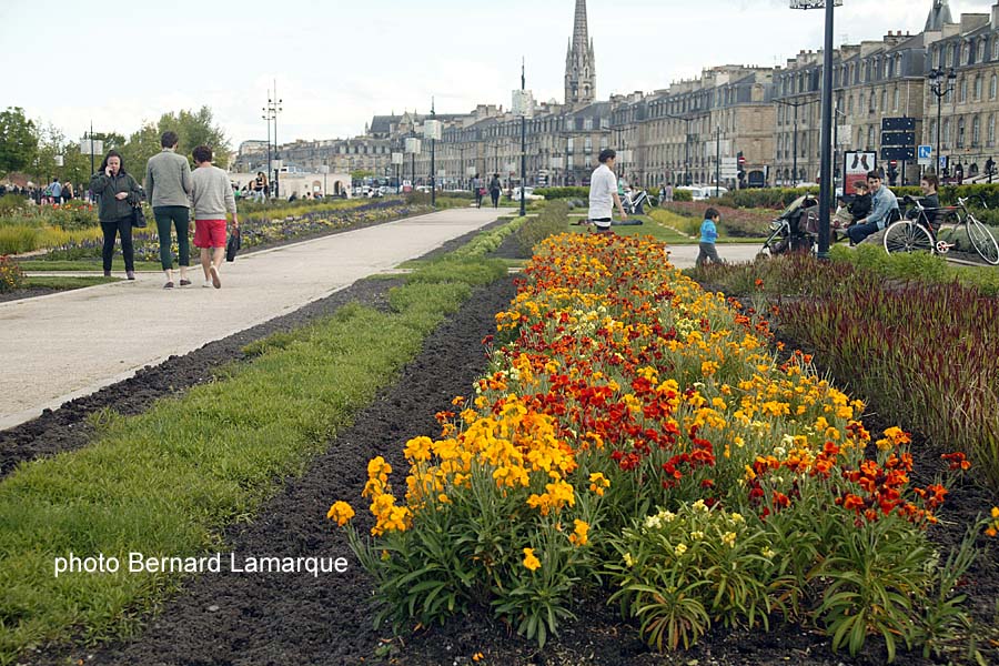 Parallèlement au "zéro phyto" en milieu urbain, le Jardin des Lumières qui se trouve de part et d’autre du miroir d’eau le long des quais Louis XVIII, des quais du Maréchal Lyautey, des quais de la Douane et du quai Richelieu, bénéficie de la gestion centralisée sur PC de l’arrosage, un élément clé dans le processus d’économie d’eau. La station météo calcule l’évapotranspiration et adapte ses paramètres de programmation en temps réel. Pour accompagner la dynamique écologique de la Ville, un module de formation au long cours est suivi par les 12 agents d’entretien des 40 000 plantes et arbustes composant les 6 000 carrés du jardin et de ses allées. Ils s’initient aux nouvelles pratiques respectueuses de l’environnement, en apprenant à favoriser les techniques alternatives au désherbage, à économiser l’eau, à tailler raisonné et à sélectionner les plantes adaptées au terrain et à sa fréquentation.
