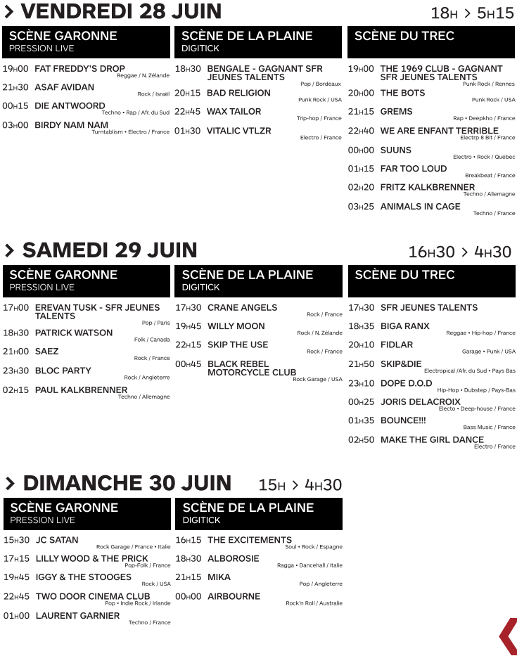 Le festival Garorock se déroulera sur la plaine de la Filhole à Marmande, du vendredi 28 au dimanche 29 juin. La billeterie en ligne disponible sur le www.digitick.com offre différentes formules :