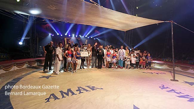 Le cirque Amar dans sa grande générosité, met à la disposition de l’Association un certain nombre de places à dix euros dont le montant est entièrement reversé à Naevus 2000 et ce de manière régulière sur les villes étapes de la tournée du cirque Amar. Ainsi la présidente de l’association Laurence Baert est amenée à se déplacer plusieurs fois par an pour recevoir un chèque et à chaque fois cela donne lieu à une petite cérémonie devant le public de la séance, soit qu’elle se termine comme à Bordeaux, soit qu’elle commence.