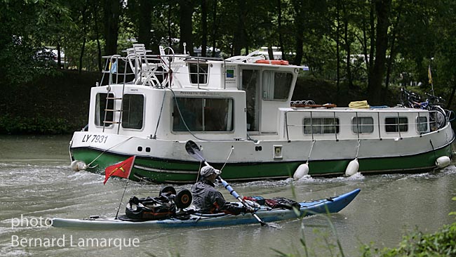 Si l’article s’ouvre sur un rappel de l’équipée de Robert Louis Stevenson et de son voyage d’Anvers à Pontoise le premier aventurier cité dans l’article est Tancrède Melet qui curieusement a entendu parlé d’un gars qui fait le canal du Midi en canoë à moins que ce ne soit en kayak et peut être lui avait on parlé de notre kayakiste bordelais. Tancrède Melet a donc fait le voyage dans le sens inverse deGérard Lajournade. Il a mis à l’eau à l’étang de Thau remonté jusqu’à Toulouse dans des conditions climatiques difficiles à la période de fin avril mais il a pu descendre la Garonne jusqu’à Bordeaux en quatre jours avec l’aide du courant et l’ensemble du parcours lui a pris 13 jours en 2010. Toute cette aventure dans ces conditions ardues vu la saison, pour aller voir une copine à Bordeaux cela mérite d’être souligné et il dit que si c’était à refaire il recommencerait comme le précise Virginie Brancotte dans son article.