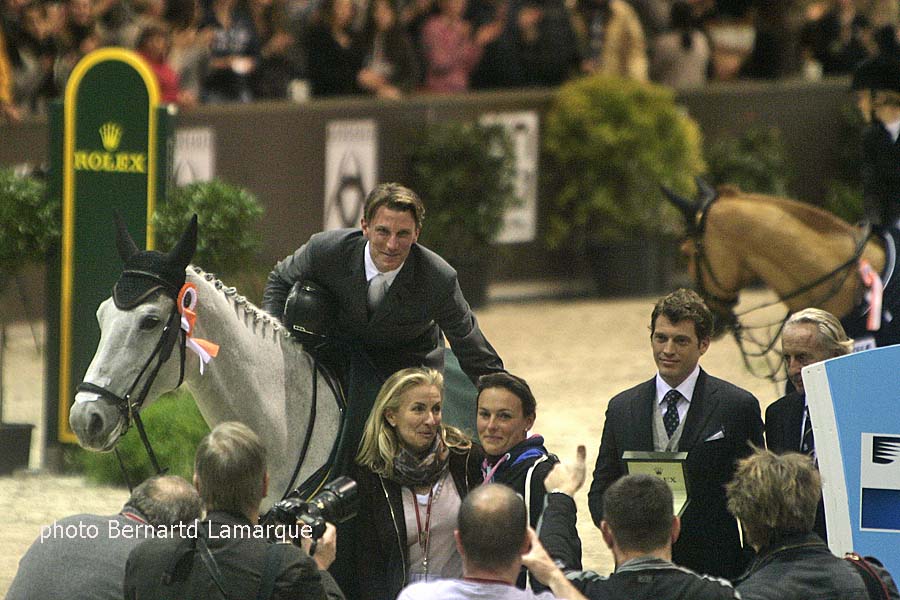 ! Kevin Staut signe là une belle victoire qui lui permet de remonter à la 2ème place du classement Rolex, victoire qu’il a partagé durant la remise des prix à sa nouvelle propriétaire, Madame Emmanuelle Perron-Pette du Haras des Coudrettes. Il ne manqua pas non plus de la remercier durant la conférence de presse donnée après le Grand prix. En effet, depuis la fin de l’année et face à l’échéance des Jeux Olympiques, la jument Sylvana de Hus était très convoitée par les équipes étrangères. Patrice Delaveau fit part de ses inquiétudes de voir la jument vendue et donc de diminuer les chances françaises d’avoir une médaille. Les propriétaires du Haras des Coudrettes, qui possédaient déjà 2 chevaux de grand prix, se portèrent acquéreur de la jument à la demande de Patrice Delaveau.