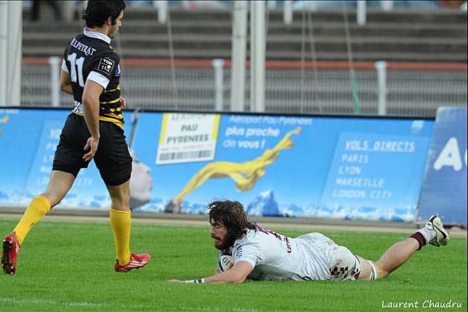 Revenons au match où sous la férule de Romain Poitre c’est Camille Lopez qui donne le coup d’envoi avec l’appui du vent qui s’est montré bien capricieux tout au long de la partie et qui d’entrée joue un tour à l’ouvreur bordelo-béglais donnant mêlée au centre du terrain au bénéfice des montois. Dès les premières minutes on sent que l’Union n’a pas fait le déplacement pour subir, mais bien pour imposer son jeu et c’est à la 10 ème minute que Chalmers récupère une passe au pied bien dosé de Lopez sous le nez du défenseur montois qui le croit en touche mais il n’en est rien et celui-ci file à l’essai en moyenne position que Camille Lopez transforme L’Union s’empare du score qu’elle ne lâchera plus jusqu’à la fin du match. Deux minutes plus tard Lopez arrose l’aile gauche de Talebula mais celui en prolongeant au pied ne pourra aplatir qu’en dehors des limites du terrain. Le ton est vraiment donné, mais on a toujours peur que l’Union en fasse trop et se fasse prendre en contre mais avec l’appui du vent les bordelo-béglais ne quittent pas le camp montois. Les avants montois en profitent pour mettre la pression sur le pack Unionistes mais seul le pied de Vignau-Thuquet va permettre d’atteindre la mi-temps sur le score de 7 à 3 pour l’UBB.