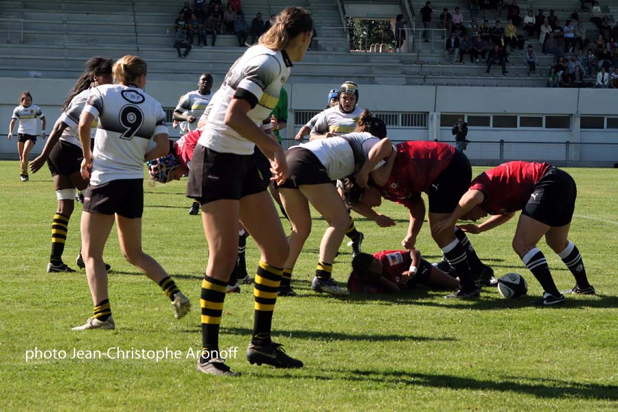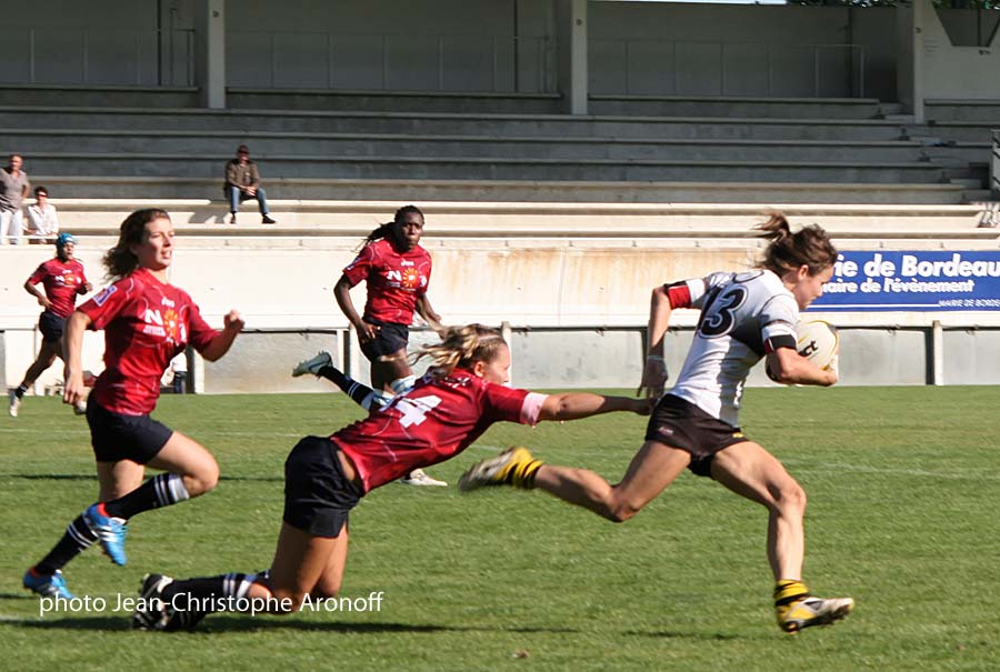 Le soleil et les spectateurs étaient présents pour cette journée de fête au Stade Bordelais. Six ans après sa création la section féminine de rugby disputait son premier match au plus haut niveau français sur ses terres. Les joueuses voulaient faire honneur à leur maillot mais l’équipe montpelliéraine forte de nombreuses internationales (11 sur l’équipe de départ) ne voyait pas les choses de cette manière. Les vices championnes de France du dernier exercice campent dans les trente mètres des locales qui jouent sans complexe et n’hésitent pas à faire circuler le ballon pour essayer par le rythme de dépasser les héraultaises. Ces initiatives ne paient pas souvent à cause de mauvais choix au moment de la dernière passe.