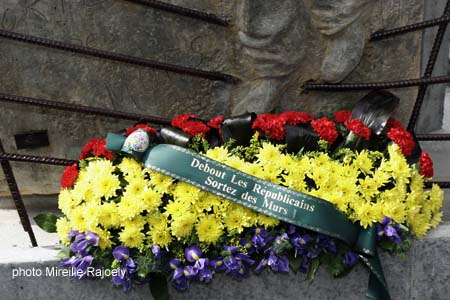 Joan Fabra-Gratacos, président de l’association pour le mémorial, après avoir remercié les autorités présentes et rappelé la genèse de ce projet très complexe à finaliser, a donné la parole à l’artiste sculpteur bacalanais Régis Pedros. Celui-ci a expliqué ses choix artistiques, la composition en 3 tableaux de son bas-relief, orné du « No Pasaran » symbole de résistance à l’oppression. Luis Diez, pour l’association bacalanaise ADIQ, a évoqué à son tour la souffrance créée par la construction de ce bâtiment de guerre. Vincent Maurin, président du groupe communiste de la ville de Bordeaux, a insisté sur la « dimension universelle du combat pour la justice sociale et la démocratie de ceux qu’on appelait les Rouges, ces ouvriers engagés contre le fascisme. » Il a appelé à la vigilance quant aux conséquences de mesures d’austérité « terreau de division et de haine ». Nathalie Delattre, représentant Alain Juppé, a expliqué l’attachement du Maire de Bordeaux au travail de mémoire et a rappelé le succès de l’exposition du photographe Augusti Centelles l’été dernier dans la base sous-marine. Elle a aussi souligné la participation de la Ville au financement du mémorial puis elle a embrassé l’artiste.