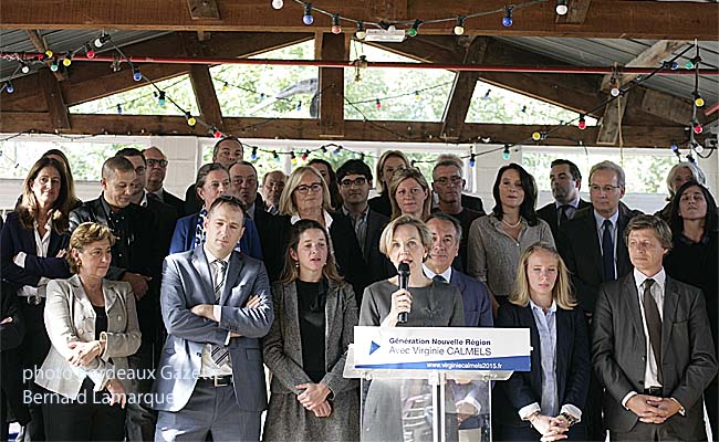 Ils étaient 45 car il en manquait 2, soigneusement positionnés autour de Virginie Calmels pour cette présentation dans le nouveau cadre de chez Alricq. Dans la liste six sortants figurent parmi les candidats (Hélène Estrade, Joan Taris, Martine Moga, Nicolas Florian, Alexandra Siarri, Sophie Mette, et Dominique Ducassou qui est remplaçant) car les listes présentent des remplaçants et on est passé de 36 conseillers régionaux pour la Gironde à 46 au prorata de la population girondine, ce qui représente une progression énorme à une époque où l’on devrait faire des économies. On peut dire que dans cette affaire le gouvernement a particulièrement manqué d’audace car au départ il était prévu de réduire le nombre de conseillers régionaux, mais qu’à cela ne tienne. La liste telle que présentée est quand même truffée d’élus locaux même si des représentants de la société civile sont bien représentés. Les deux grands inédits de cette liste restent Pierre Durand et Mathieu Bisseni, personnages sympathiques au demeurant aussi bien l’un que l’autre. Pierre Durand s’est laissé convaincre sur les valeurs et Mathieu Bisséni parce que l’on est toujours un pivot quelque part. Pour Yves d’Amécourt sa position sur la liste qui va le conduire au Conseil Régional est une forme de revanche car il n’a pas digéré son élimination du Conseil Départemental qu’il souhaite voir disparaître à terme, toujours séduit par la formule du conseiller territorial. Un effort a été fait pour faire figurer un candidat des confins du département avec le maire de la Roquille (qui sait ou se situe La Roquille ?) et on aurait pu faire plus fort avec un représentant de Margueron. La moyenne d’âge de la liste est de 47 ans et Virginie Calmels a insisté sur le fait que la liste ne subirait aucun changement entre les deux tours puisque l’union est faite dès le premier tour.