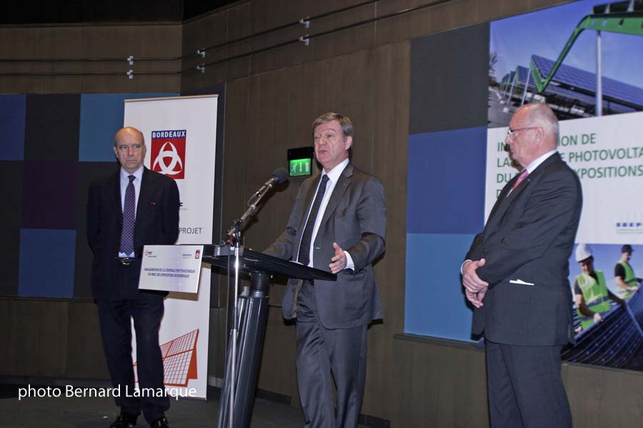 C’est Hugues Martin en tant que Président de SBEPEC qui a ouvert le feu des discours en précisant que cette réalisation était emblématique à double titre tout d’abord en tant que plus grande centrale urbaine et ensuite en tant que marqueur de la volonté affichée de faire de Bordeaux une ville écologique dans tous les sens du terme à travers ses réalisations. Il s’est montré d’autant plus satisfait que le projet a failli ne jamais voir le jour car lancé en 2008, les conditions de rachat de l’électricité photo voltaïque évoluant régulièrement, il a fallu lancer une nouvelle consultation dans l’urgence et sur la base des tarifs de rachat revus à la baisse impliquant des délais tendus après la validation de l’appel d’offre. Alain Juppé a voulu rappeler les efforts de la ville en matière d’énergies renouvelables qui a vu Bordeaux acquérir la labellisation Cit’ergie qui est venue récompenser ces efforts. Pour sa part Yvon André, Directeur Général Délégué d’EDF Energies Nouvelles a précisé "Nous sommes particulièrement fiers d’ajouter cette réalisationà nos références. Son implantation sur une infrastructure existante et sa conception architecturale, ajoutées à la qualité du service offert aux visiteurs ne peuvent faire que l’unanimité sur ce projet. C’est une vraie vitrine pour l’énergie solaire et un aménagement exemplaire d’un lieu public mené par la ville de Bordeaux." Il est vrai qu’a Bordeaux vu la superficie des parkings des grandes surfaces une stratégie globale d’équipement pourrait être bénéfique, mais on n’en n’est pas là et souhaitons que la réalisation fasse école.