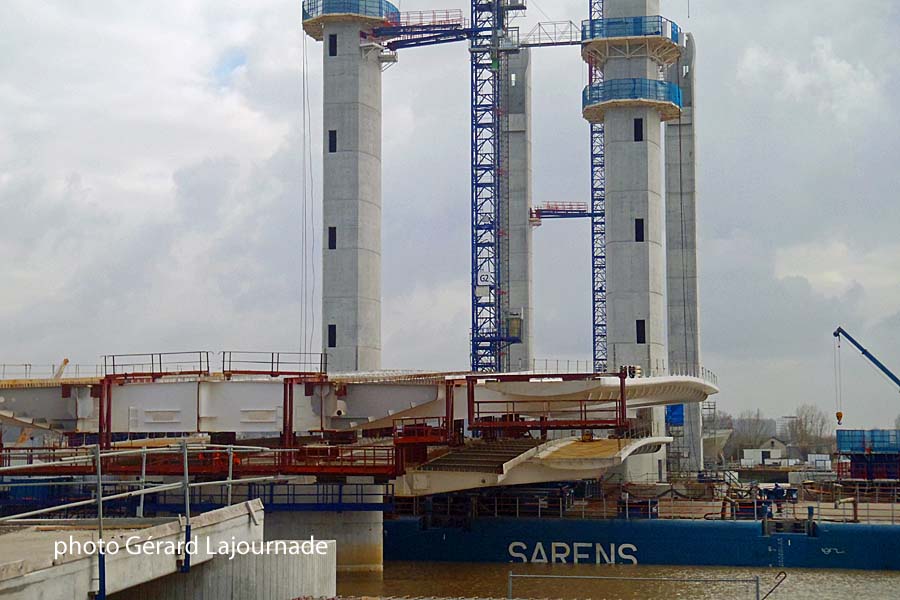 Elles ont été prises en charge dans l’estuaire sur leur barge de transport par des remorqueurs d’assistance pour être ancrées provisoirement à Bassens avant d’être positionnées à proximité du chantier 4 jours avant la dépose de la première partie de la travée. Pour pouvoir placer les parties de travée à leur emplacement, il faut les faire pivoter sur leur barge de transport. Pour placer la première partie de la travée qui est positionnée au dessus, il faut amener la barge à marée haute en position correcte et l’installer avec l’aide du descendant ; l’opération est délicate car l’ajustage se fait à moins du centimètre près pour une structure de 44 m de large sur 86,10m de long. On positionne ainsi la partie la plus longue en premier puis la partie la plus courte. Ensuite on retire la barge qui va être utilisée de la même manière pour installer la deuxième partie de la travée et il ne restera plus qu’à souder les deux parties pour les solidariser.