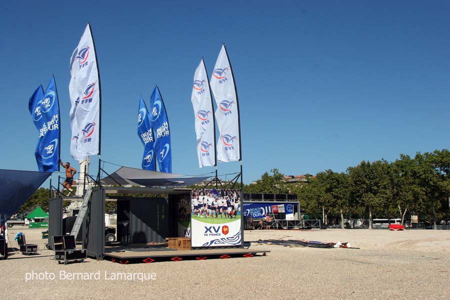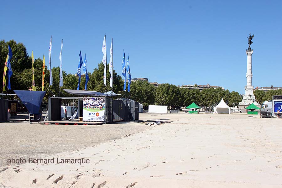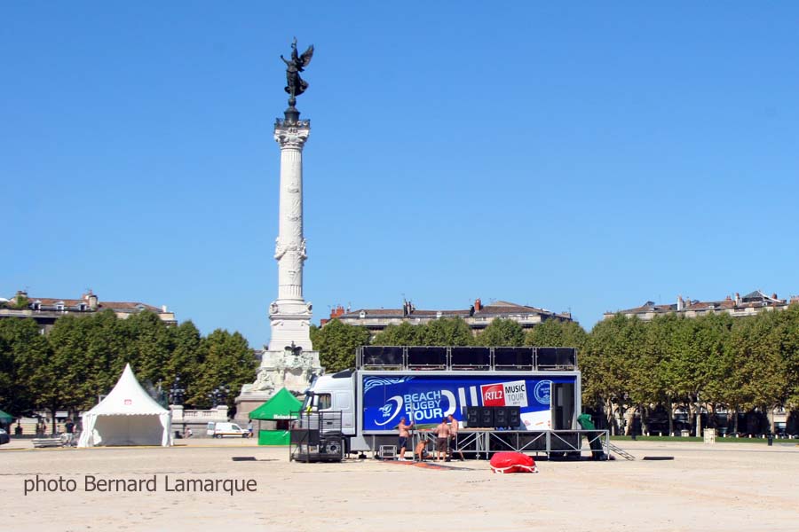 Le Beach Rugby Tour se prépare à accueillir les amateurs sur la place des Quinconces pour 3 jours. Les terrains de sable d’une épaisseur de 15 cm sont déjà installés et délimités depuis quelques jours et ils se situent côté Est de la place (côté fleuve), la partie Ouest (côté Colonne des Girondins) étant réservée au village du Beach Rugby Club. La vocation première du Beach Rugby Tour est de faire découvrir la pratique du rugby à un nouveau public de façon ludique, autour de matchs de rugby à toucher, d’ateliers d’initiation au rugby et d’animations divertissantes, les pieds dans le sable.
