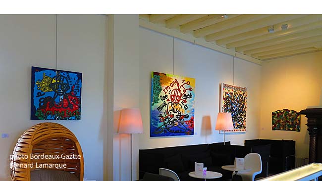 C’est au au Saint James haut lieu de l’Hôtellerie et de la Gastronomie qui voit se succéder aux fourneaux des chefs étoilés et qui accueille une clientèle particulière dans son hôtel édifié par Jean Nouvel qu’a lieu cette exposition. Elle permet à Joffo de se confronter à un public qu’il ne connassait peu ou pas et à l’hôtel d’acueillir un public qu’il n’a pas l’habitude de voir ; du coup les rencontres peuvent être étonnantes et fructueuses.
