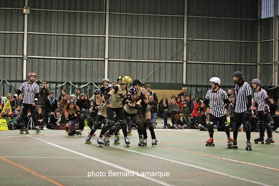 Pas de répit pour vos derby girls préférées qui enchainent match après match depuis début novembre. Celui-ci avait un enjeu particulier puisque les deux équipes, qui ne s’étaient jamais rencontrées, n’ont connu aucune défaite depuis la rentrée. Encore une fois, quelques 400 aficionados ont répondu au rendez-vous pour encourager leur équipe favorite et réchauffer l’ambiance – et la température ! – dans la Halle des Sports de Talence. Les dix premières minutes de jeu ont donné un léger avantage de 17 points aux Petites Morts, avantage rapidement conforté par un power jam* provoquant une envolée des scores à hauteur de 92 à 21.