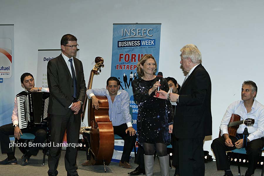 L’ensemble musical a permis de faire patienter pendant les longues minutes qui ont précédées la cérémonie, le temps que tout le monde arrive et que tout le monde se mette en place. Louable initiative car le temps aurait pu paraître long entre l’horaire annoncé et le début effectif de la remise des "Trophées" aux " "Talents" qui s’étaient déplacés pour recevoir leur prix car malheureusement et c’est regrettable pour eux certains n’ont pu se déplacer pour des raisons tout à fait valables d’éloignement ou de soucis d’entreprise voire personnels. C’est Quitterie Delfour, directrice générale de la société Artiga à Magesq, venue en voisine qui a ouvert le cortège des "Talents" et on a pu regretter au cours de cette soirée qu’il n’y ait que peu de femmes dans cette fournée de "Talents". William Techoueyres lui a succédé sur scène et lui c’est vraiment en proche voisin depuis le Pyla qu’il est venu pour venir cueillir les fruits de l’essai qu’il a transformé dans la restauration en reprenant la Corniche qui a l’aide de Philippe Stark est devenue la Co(o)rniche. Heike Faulhammer d’Arkema France (Basses-Pyrénnées) n’ayant pu être là c’est Alain Afflelou bousculant un peu l’ordre pré établi pour des raisons d’impératif horaire qui s’est vu remettre son "Talent" par Emmanuel Gadret associé Responsable de Deloitte pour le Grand Sud-Ouest. Puis se sont succédés Patrick Palem pour la Socra (Dordogne), Christopher Shafroth de Crescendo (Agen), Eric Plantier de FP. Bois (Mimizan), Jacques Vial co repreneur de l’Usine Delage à Tocane Saint Apre était dans ses petits souliers pour recevoir son trophée lui qui fabrique de l’espadrille. Pour continuer c’est Bernard Benito le vrai local de la soirée qui est monté sur scène puisqu’il n’a eu qu’à franchir le pont d’Aquitaine pour se laisser glisser jusqu’au Lac depuis Lormont pour recevoir la distinction pour Benito SA qui est en plein développement.