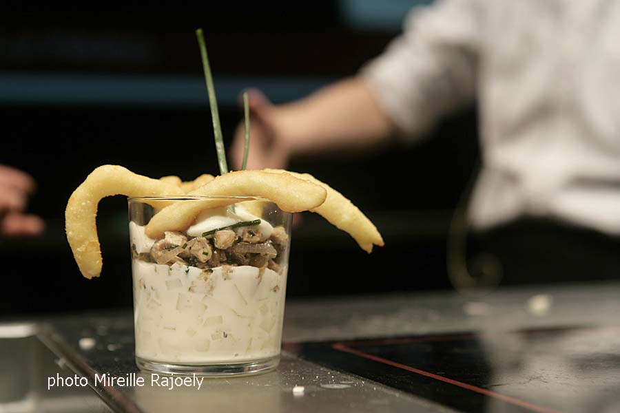 C’est à un programme un peu modifié auquel les invités ont eu droit, car il fallait avoir un carton d’invitation pour rentrer et avoir le droit de déguster les trouvailles des chefs. En fait, le plus souvent, il est apparu qu’il s’agissait de déclinaisons subtiles et intelligentes de recettes plus traditionnelles quand il s’agit de marier hareng et pommes de terre, pommes de terre et cabillaud, voire pomme de terre et volaille ou même œuf et pomme de terre. Tous les chefs ont phosphoré sur le basique tubercule pour offrir une recette de plat relativement simple, car il faut bien injecter de l’inventivité dans ces réalisations et un peu de complexité.