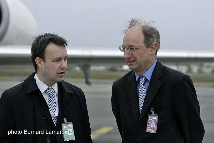 - Edo Friart, Directeur du Développement français de Volotea et Pascal Personne, Président du Directoire de l’aéroport de Bordeaux-Mérignac en discussion sur le tarmac