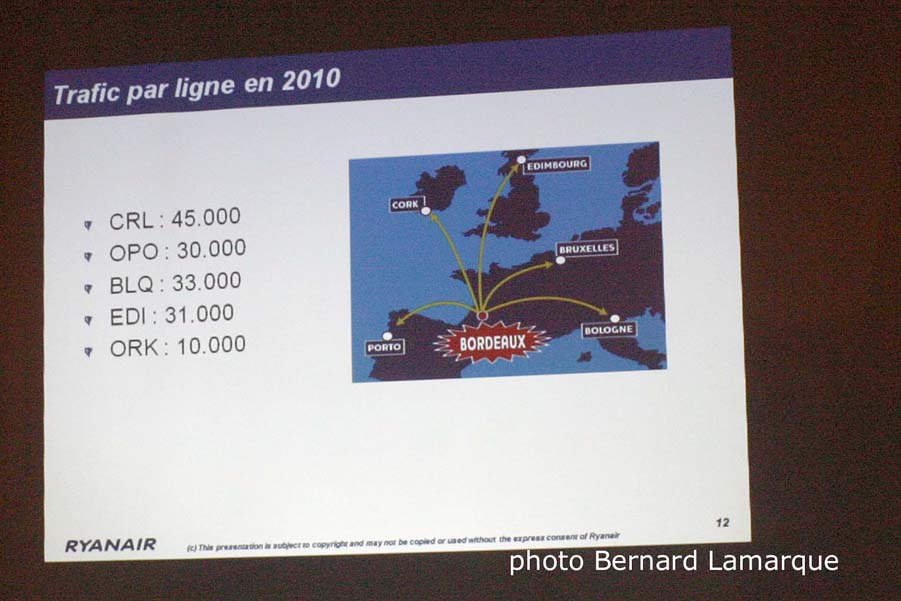 Les 2 premières lignes (Bruxelles-Charleroi et Porto) sont opérationnelles cet hiver, alors que les premiers vols vers Bologne Edimbourg et Cork débuteront à partir de fin mars 2011. Ryanair prévoit 190.000 passagers sur Bordeaux cette année ce qui représente 190 emplois directs ou indirects (on compte un emploi pour 1.000 passagers). Le trafic en 2010 a été 45.000 passagers vers Charleroi, Porto 30.000, Bologne 33.000, Edimbourg 31.000 et Cork 10.000 (trafic juillet/août). "La base de Marseille a été fermée en janvier 2011 et nous avons 130 lignes desservies et une seule domestique" Jonathan Brisy.