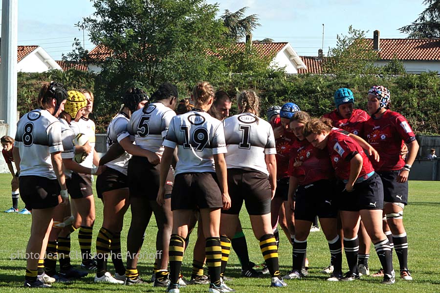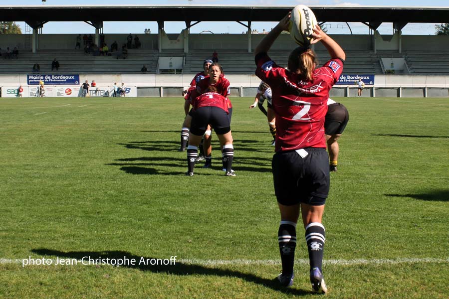 Sur la touche, les bordelaises se mettent à nouveau à la faute. Gaëlle MIGNOT, talonneur de Montpellier et de l’équipe de France, sûre de ses forces reprend une touche qui finira dans l’en but pour le premier essai collectif. Le deuxième arrivera avec un premier ballon perdu sur mêlée et un contre arrêté in extremis par Laürelin FOURCADE sur la ligne. Sur la mêlée qui suit Safi NDYAE fait parler sa puissance pour marquer le second essai du match. Très bien organisée sur les réceptions de coup d’envoi, les coccinelles reviennent vite dans le camp bordelais. Le troisième essai sera la copie conforme du premier avec une pénal-touche, 15 à 0 après un quart d’heure de jeu, le pack de Montpellier prive de ballons son homologue surtout sur la mêlée. Les visiteuses ne lâchent rien et réalisent des bonnes séquences avec de l’alternance. Les soucis de conservation ne permettent pas de concrétiser et les bras de Marine DE NADAI, deuxième ligne de l’équipe de France, sont en grande partie responsables de ces pertes de balle. Les bordelaises, pleines de bonne volonté, manquent parfois de patience et se débarrassent trop vite du ballon. Le quatrième essai viendra d’ailleurs d’un mauvais jeu au pied qui est récupéré encore une fois par DE NADAI qui passe les bras pour son ailière. Elle finira quelques secondes plus tard et cinquante mètres plus loin dans l’en-but. Sur le coup d’envoi qui suit, deux mauvais placages permettent à Montpellier d’enclencher la marche avant. Le turbo s’appelle NDYAE qui passe une nouvelle fois les bras pour une percée de TOUPIN. Huit temps de jeu après c’est Elodie PORTARIES pilier de l’équipe de France qui finit dans l’en but. A la pause le score est fait pour Montpellier qui réattaque le deuxième acte sur les chapeaux de roue. La troisième ligne s’illustre avec le même scénario. NDYAE perce, DJOSSOUVI est au soutien et RAYSSAC termine le travail. La moindre erreur se paie cash, le placage raté de MARIE sur PARRA est à l’origine du septième essai, le seul qui sera transformé.