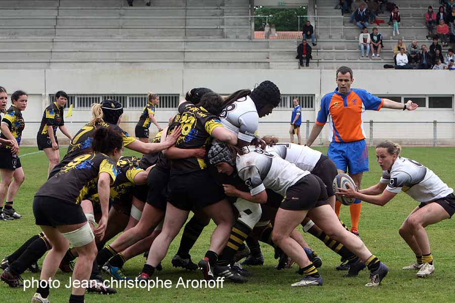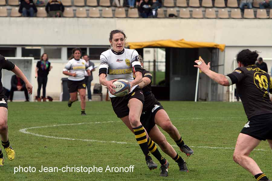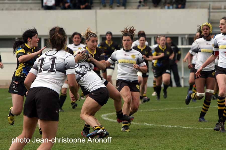 Après un ballon volé à l’adversaire en touche, le Stade Bordelais enchaine d’abord avec les avants puis avec les trois quarts pour un bel essai de Laürelin FOURCADE qui déborde toute la ligne adverse. C’est le deuxième en deux matchs, le pied de LAGOUGINE ne tremble pas et permet à son équipe de revenir à un point de Sassenage. Il faut retourner dans le camp adverse pour valider cette domination du début de la deuxième mi-temps. La réception du ballon est assurée mais en suivant les locales sont pénalisées pour un ballon gardé au sol. C’est un mal récurrent sur cette fin de saison avec une porteuse de balle qui ne domine pas assez son adversaire et se laisse tomber trop facilement. Les soutiens ont un temps de retard par rapport à l’adversaire ou se trompent de cible pour obtenir des ballons propres. Sassenage donnera tout dans la bataille et va camper pendant vingt minutes dans les vingt-deux mètres adverses. La demi de mêlée, Sabine CAMOING, internationale depuis les tests d’automne, joue toutes les pénalités rapidement et dynamise pour essayer de prendre à défaut la défense bordelaise. Les joueuses des Alpes n’ont rien à gagner sur cette rencontre et veulent marquer un essai. La fin de match leur fera regretter de ne pas avoir tenté une ou deux pénalités pour se mettre hors de portée des bordelaises. Ces dernières ont certes été fébriles en attaque mais ont montré un courage énorme pour défendre leur en-but. Cette solidarité sera également une des clés du match de barrage le premier week-end de juin.