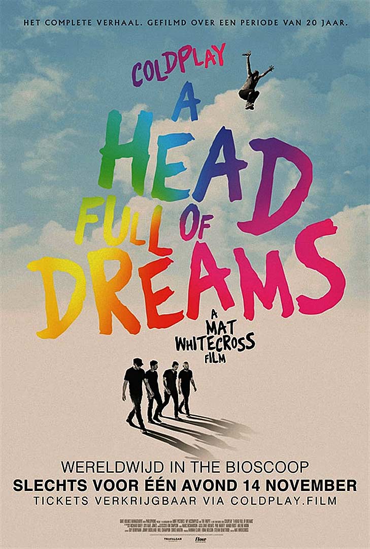 Synopsis : A Head Full of Dreams nous plonge dans l’intimité du groupe Coldplay pour nous faire revivre son ascension spectaculaire, des arrière-salles des pubs londoniens de Camden aux concerts à guichets fermés dans les plus grands stades de la planète. Cette histoire, c’est avant tout celle d’une fraternité indéfectible, qui a permis au groupe de rester soudé tout au long de leur parcours.