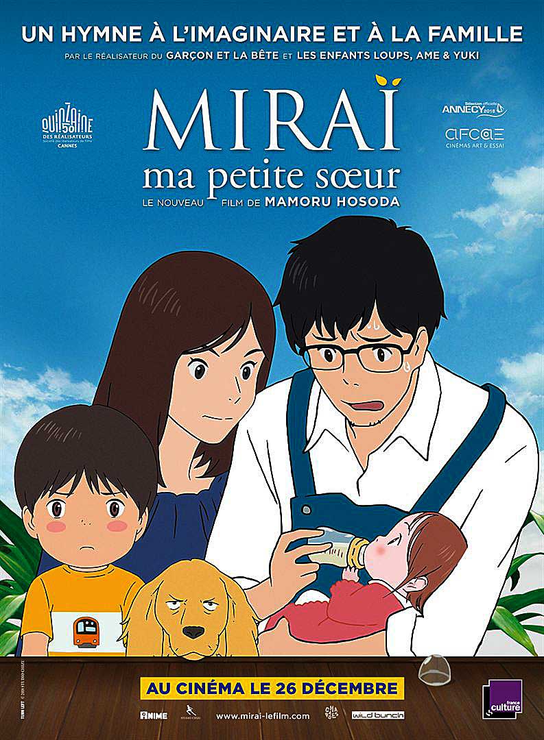 Synopsis : Kun est un petit garçon à l’enfance heureuse jusqu’à l’arrivée de Miraï, sa petite sœur. Jaloux de ce bébé qui monopolise l’attention de ses parents, il se replie peu à peu sur lui-même. Au fond de son jardin, où il se réfugie souvent, se trouve un arbre généalo-ma-gique. Soudain, Kun est propulsé dans un monde fantastique où vont se mêler passé et futur. Il rencontrera tour à tour ses proches à divers âges de leur vie : sa mère petite fille, son arrière grand-père dans sa trépidante jeunesse et sa petite sœur adolescente ! A travers ces aventures, Kun va découvrir sa propre histoire.