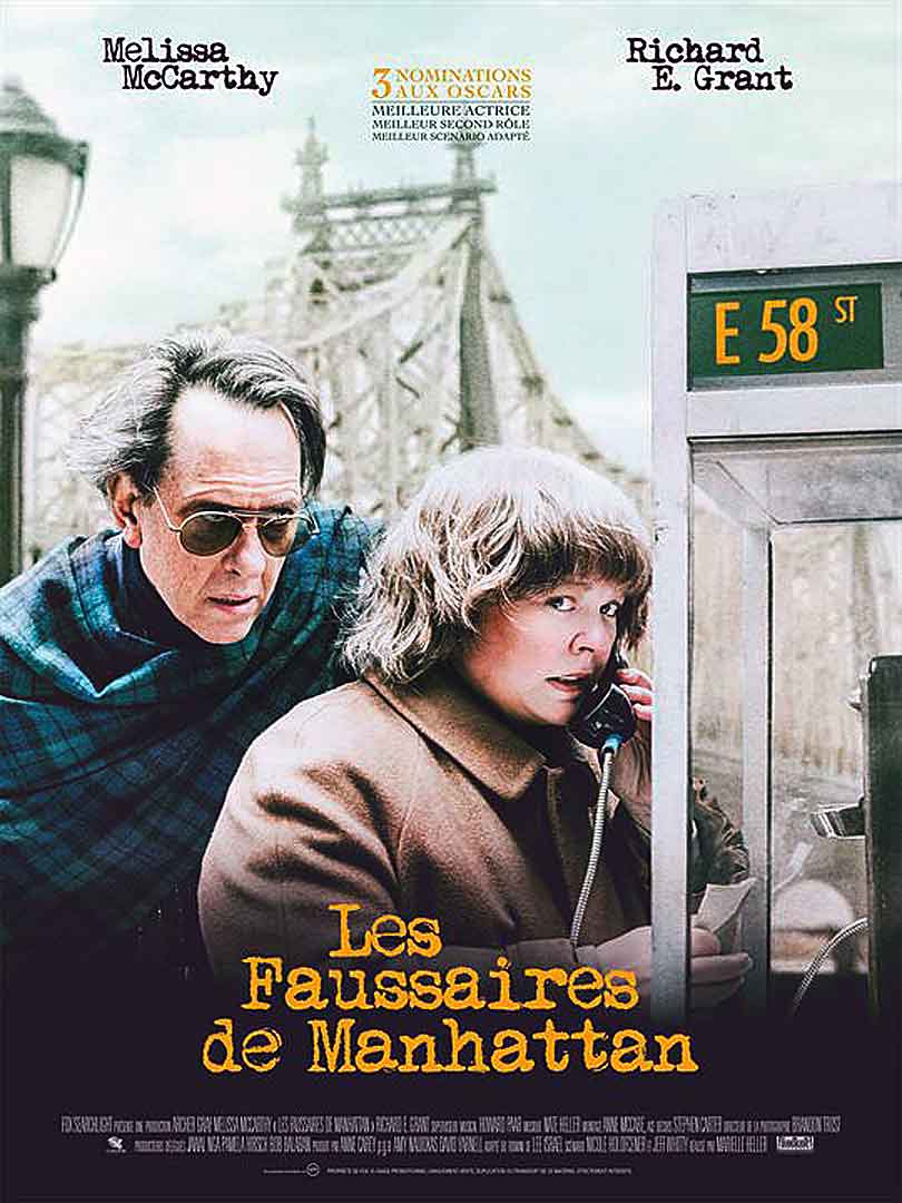 Synopsis : Ancienne auteure à succès aujourd’hui sans le sou, Lee Israel se découvre par hasard un don exceptionnel : celui d’imiter à la perfection le style de grands romanciers. Avec l’aide de son ami Jack, elle monte une arnaque imparable : rédiger de fausses correspondances entre auteurs célèbres, que Jack revend à prix d’or aux collectionneurs new-yorkais. Grisés par le succès, les deux faussaires ne voient pas que le FBI commence à s’intéresser à eux…