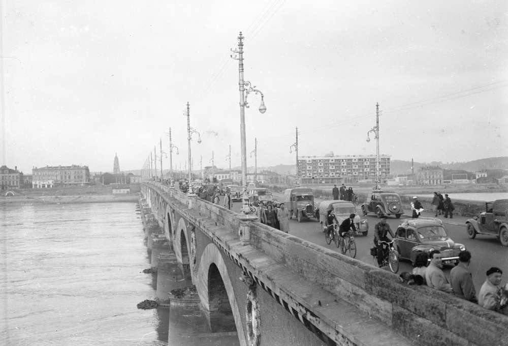 - Avril 1953. Circulation des automobiles, bicyclettes et piétons sur le pont de pierre.