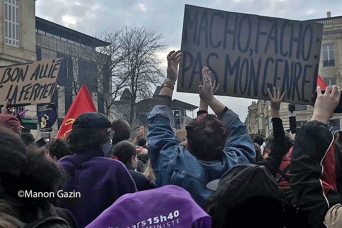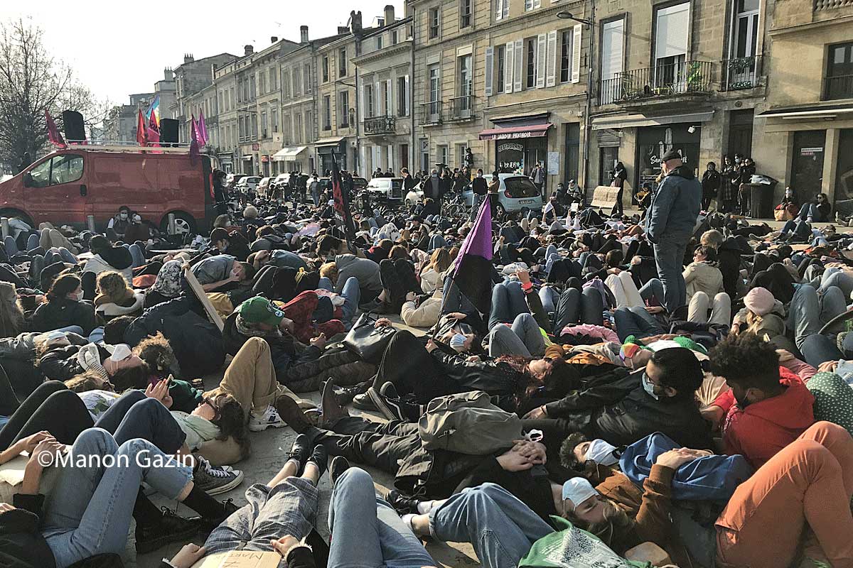 D’autres personnes vont prendre le micro, comme des représentants de syndicats ou d’associations, des artistes ou simplement des militants voulant crier leurs revendications. De nombreuses communautés étaient présentes : les droits pour les personnes de la communauté LGBT ont été exigés, comme la fin de la mention du sexe sur l’état civil, la PMA pour toutes, ou encore la fin des mutilations sur les enfants intersexes. Ont aussi été dénoncées les violences policières, le racisme, l’homophobie, les mesures anti-migrants et la précarité étudiante. L’évacuation en février dernier des 300 personnes du squat de la “zone libre” de Cenon a été citée de nombreuses fois, et pointée du doigt comme étant inhumaine. “Notre féminisme, il n’a aucune frontière”, crie une organisatrice au micro. Une manière de dire que toutes les communautés sont les bienvenues pour manifester ici. Un “Dying” a eu lieu devant le Palais de Justice : toutes les personnes présentes sur la place s’allongent pendant deux minutes, pour rendre hommage aux femmes mortes sous les coups de leurs conjoints ou de leurs exs, et aux futures victimes de féminicides. De nombreux autres rassemblements ont eu lieu partout en France. A Paris, près de 30 000 personnes étaient présentes.