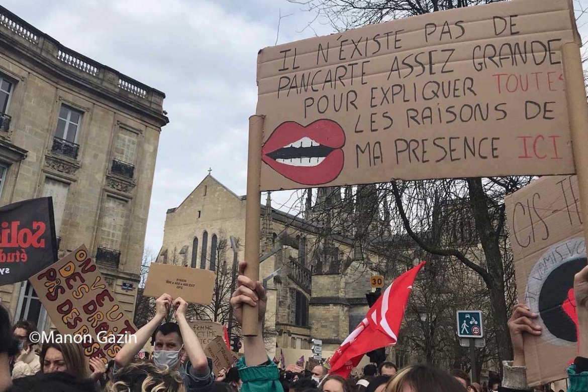 Une journée forte en émotions. Lundi 8 mars 2021, plus d’un millier de personnes ont manifesté pour la journée internationale des droits des femmes. Le rassemblement était organisée par le Planning Familial de Gironde, et de nombreux collectifs féministes etaient présents, comme l’Assemblée féministe, le Collectif bordelais pour le droit des femmes et le collectif Fack-ap. Certains syndicats étaient aussi dans la rue, comme la CGT, l’Union syndicale Solidaires ou encore la FSU.