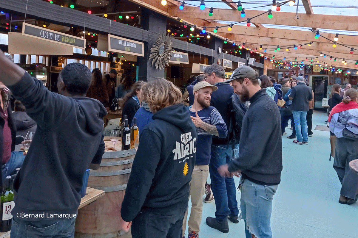 Ce "chais Alriq" n’était nullement en plein air mais aller se promener sur les quais rive droite pour découvrir ce qu’il s’y passe n’a rien d’engageant sous la pluie alors que quand il fait beau on va volontiers se promener pour découvrir les manifestations festives comme ce "chais Alriq" qui regroupait vingt trois producteurs d’horizons divers bien à l’abri dans les espaces couverts du lieu qui s’y sont prêtés à merveille et qui faisaient déguster leurs breuvages provenant aussi bien de l’Alsace que du Beaujolais ou même de la Cadurci à la Bourgogne en passant par les Corbières voire du Languedoc Roussillon ou de la Loire sans oublier les étiquettes locales du Bordeaux. Les éléments fédérateurs de ce rassemblement restant essentiellement des vins conduits au plus près du naturel avec le minimum de chimie qu’il s’agisse de cultiver la vigne ou élaborer le breuvage sans pour autant afficher l’étendard du biologique et on peut plus parler de vins de tradition naturelle. Il est vrai que vu le temps il fallait avoir la curiosité de pousser son nez au delà du portail d’entrée de la guinguette "Chez Alriq" pour s’avancer à l’intérieur et retrouver tous ces vignerons rassemblés en ce lieu conviviale et tranquille.