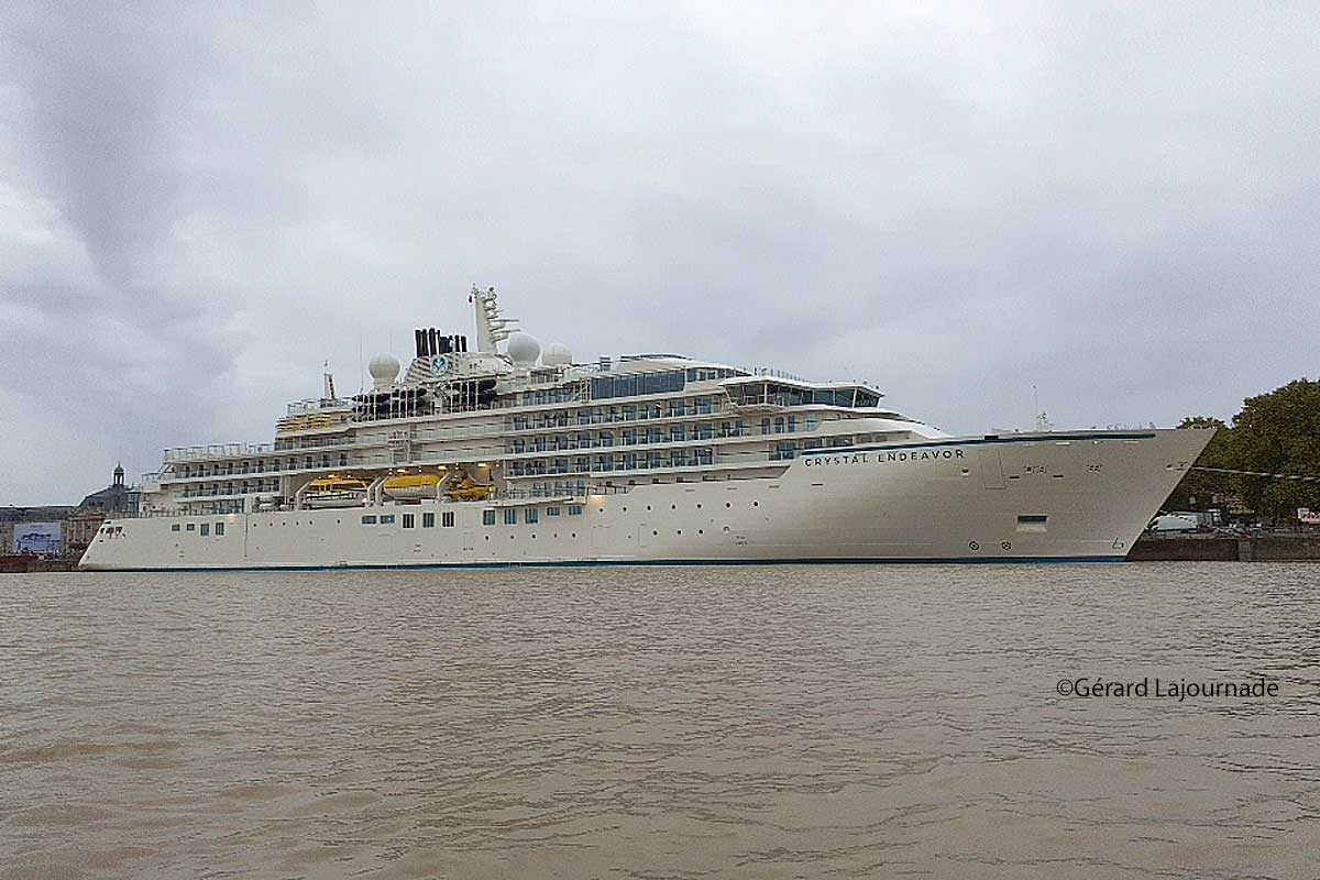 Le Crystal Endeavor n’était jamais venu à Bordeaux car c’est un navire très récent qui est sorti des chantiers allemands MV Werften-Warnemünde à Rostock, le 10 juillet de cette année. Cette croisière s’effectue dans le cadre d’escales inaugurales et au programme il y avait quatre ports français dans cette croisière : Caen-Ouistreham, Saint-Malo, Concarneau et Bordeaux où il passe deux jours sa plus longue escale de sa longue croisière. Affichant 164,5 mètres de long sur 23,4 mètres de large il peut accueillir 200 personnes à bord et c’est un navire de luxe conçu pour les croisières d’expédition de la classe "ice-strengthened expedition mega-yacht" et c’est le plus grand méga-yacht de classe glace au monde. Bordeaux est sa dernière escale française, quand il repartira ce sera pour rejoindre Donostia-San Sébastien, puis Aviles, ensuite Vilagarcia de Arousa et finir par rejoindre Lisbonne le 8 octobre qui sera le terme de sa croisière et il ne compte à son bord qu’une centaine de passagers essentiellement de nationalité américaine. Il quittera Lisbonne pour rejoindre Rio de Janeiro où il effectuera ensuite une croisière entre Rio et Buenos-Aires.