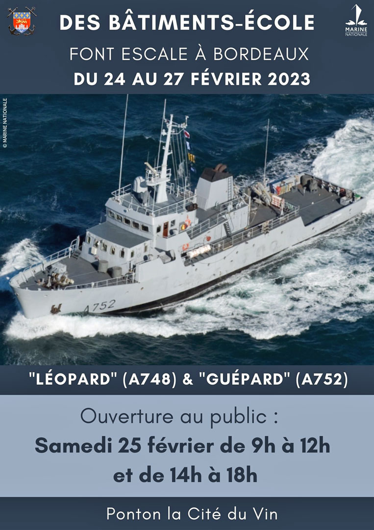 C’est ce samedi que sur une journée on pourra avoir accès à la visite du batiment école Léopard, immatriculé (A 748) qui est amarré à couple avec le Guépard (A 752) au ponton de la Cité du Vin.