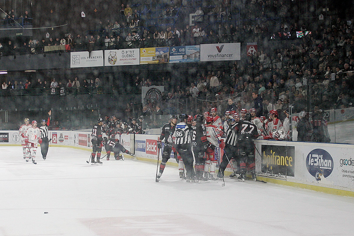 Et il faut attendre la 28e minute pour que, malgré l’inversion du cours du jeu, Loik Poudrier libère le public qui assiste au traditionnel « jet » de peluches symbolisant le premier but de la partie. Bordeaux ouvre le score et lance les hostilités sur sa patinoire, devant des supporters qui exultent enfin. L’exploit est plus proche que jamais et se concrétise. Mais il en faut plus pour décourager les champions en titre qui, malgré la remise en question imposée par leurs adversaires, trouvent la faille et viennent éteindre la ferveur du stade du bout de la cross de Markus Poukkula, à peine deux petites minutes plus tard. Cependant, malgré la grosse entame de Grenoble dans cette seconde période, la domination s’inverse petit à petit. Bordeaux, amené par un Fouquerel des grands soirs, remet la main sur le palais et inverse la tendance. Les esprits s’échauffent et la tension se fait ressentir sur la patinoire : Grenoble n’a pas l’habitude de se faire bousculer de cette manière en ligue Magnus et Bordeaux tient l’exploit entre ses mains. Le nombre de pénalités augmente alors considérablement et témoigne de cette envie de prendre coûte que coûte l’ascendant sur l’adversaire pour se sortir de cette situation étouffante. Et c’est une fois de plus Bordeaux qui se démarque en reprenant la tête du match à la 37e minute grâce à un doublé de Loik Poudrier, juste avant la fin du second tiers temps.
