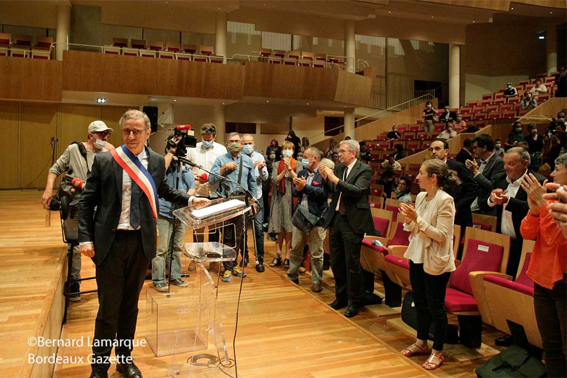 Les impétrant(e)s étaient installés dans la partie centrale du Grand Auditorium en occupant un siège sur deux et portant le masque pour éviter toute contamination virale bien sûr et chaque élu(e) est venu voter à l’appel de son nom. Il faut préciser qu’à l’appel de candidature pour le poste de maire seul Bordeaux respire et Bordeaux en lutte ont proposé un candidat(e), montrant en cela qu’on ne sait pas qui est le patron de l’hybride Union pour Bordeaux. Si Nicolas Florian s’est autorisé à transgresser la règle en ôtant son masque pour se faire photographier sans masque au moment où il glissait son bulletin dans l’urne, tous les autres candidat(e)s ont soigneusement respecté la règle après s’être désinfectés les mains avant de saisir leur enveloppe et voter. Selon des règles très sanitaires et protocolaires le dépouillement a donné sans surprise, avec un décompte exact, le résultat de l’élection de Pierre Hurmic à la tête de la Municipalité bordelaise et il est venu sous les applaudissements se faire ceindre de l’écharpe tricolore emblème de sa nouvelle fonction par Camille Choplin et de prendre la parole pour son premier discours de maire de Bordeaux.