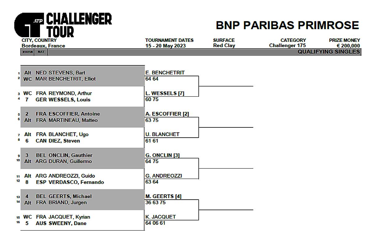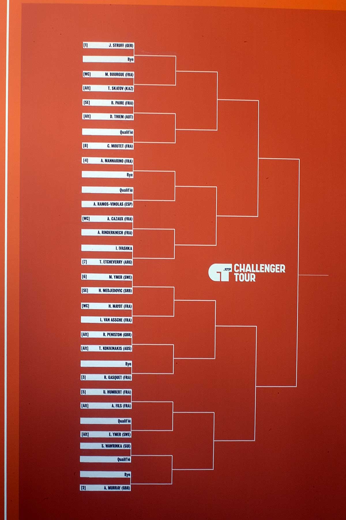 C’est ainsi que pour constituer le tableau de ce Tournoi de Primrose les têtes de séries un, deux, trois et quatre n’auront pas d’adversaire au premier tour et ce sera repos pour Struff (1), Murray (2), Gasquet (3) et Mannarino (4) mais il faut d’abord terminer les qualifications avec le second tour de ce Challenger Tour où seuls quatre candidats sortiront de ce tableau et on connaitra ainsi le tableau définitif pour cet ATP 175 qui a montré quelques difficulté à être constitué avec les exclu du tournoi de Rome et on n’a pas récupérer assez de "perdants chanceux" (Bye) pour constituer le tableau complet par contre les qualifiés vont avoir de gros morceaux" à se mettre sous la dent comme celui qui affrontera par tirage au sort Wawrinka et dès le second tour se profile un choc Wawrinka Murray qui va attirer la foule à n’en pas douter avec des gradins archicombles.