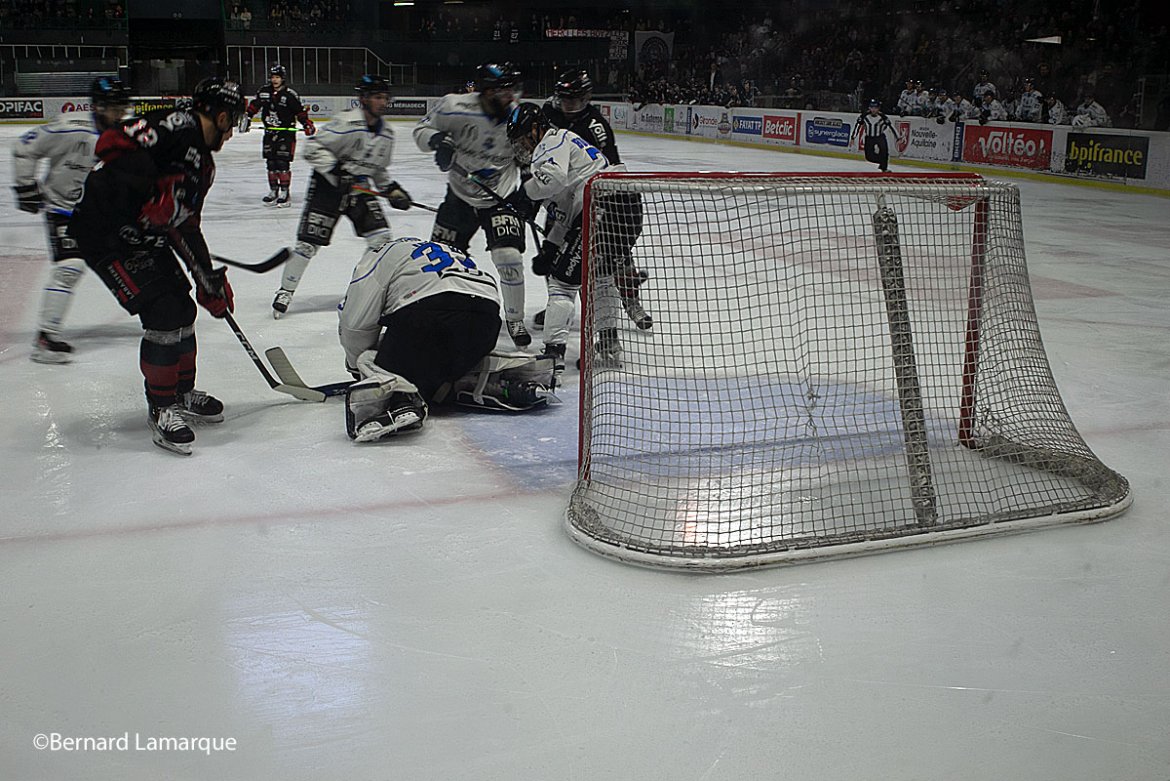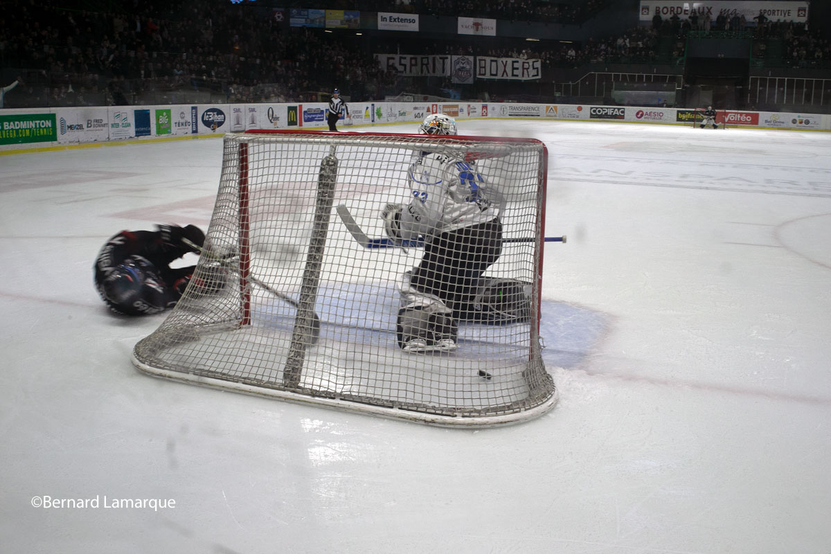 Malgré une attaque trop imprécise, Bordeaux a imposé, dès le premier quart temps, un défi physique à ses adversaires qui ont su répondre et émettre une grosse opposition. Ce rapport de force sur la patinoire a pour conséquences d’échauffer les esprits des joueurs qui commettent de plus en plus de fautes. Au terme de 20 premières minutes maitrisées, c’est Gap qui s’en sort le mieux en ouvrant le score à la dernière seconde de cette première période. S’en suit alors un réveil bordelais qui riposte et débloque son compteur dès la première minute de jeu lors de la seconde manche de ce combat intense. Mais la défense de l’équipe à domicile, pourtant en place en début de match, s’effondre en l’espace de 1 minute 30 en encaissant deux buts presque coup sur coup et les Boxers vont gueroyer ferme pour revenir à un but d’écart en fin de deuxième période.