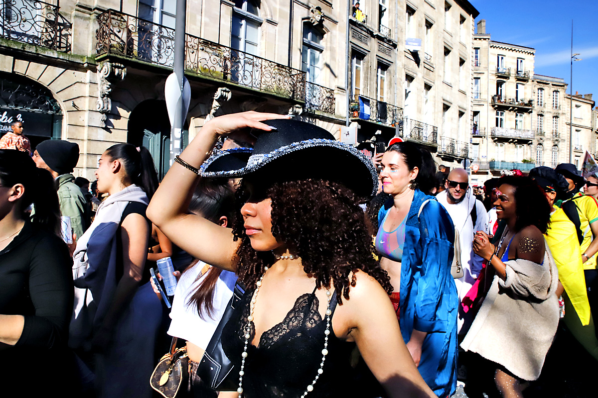 Cours Victor-Hugo, le public se densifiait à mesure que la parade avançait. Familles venues des quartiers bordelais ou de la métropole, groupes d’amis, curieux attirés par le soleil retrouvé : la foule occupait trottoirs et balcons. À l’arrière, les sonorités caribéennes prenaient le relais des fanfares plus traditionnelles du début de cortège.