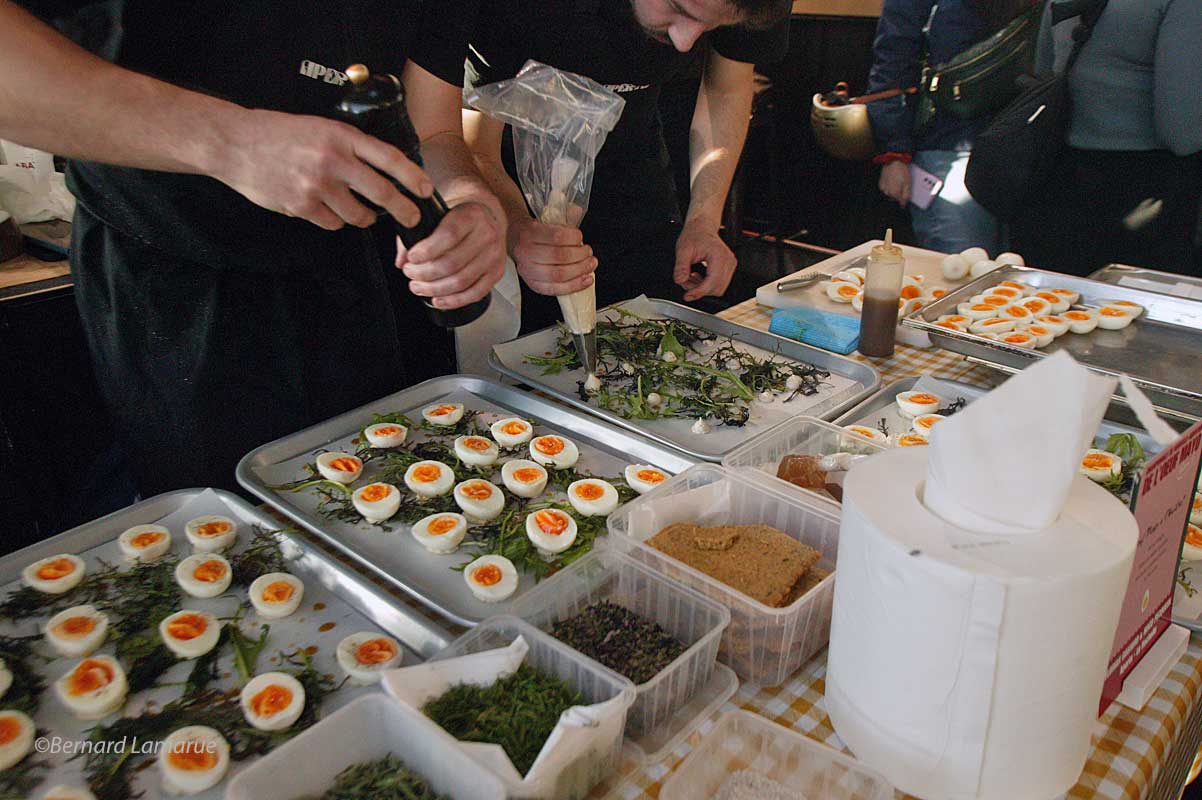 On a vu très tôt s’afférer les concurrents dans la présentation de "leur œuf mayonnaise" et il y avait autant de recettes différentes que de concurrents pour le soumettre à la dégustation qui s’effectuait à l’étage dans une salle isolée pendant que dans les Halles les spectateurs suivait avec intérêt les moindres gestes des restaurateurs en concurrence. On pouvait voir sur des fiches les produits intégrant chaque recette de ces préparions. Pendant cette période de fabrication et de dégustation qui s’est effectuée après tirage au sort, les premiers à passer on eut un peu moins de temps pour préparer leur œuf, mais tous ont paru remarquablement organisé, ce qui est normal pour des professionnels. Durant toutes ces heures c’est l’iconoclaste Philippe Maurice qui faisait patienter les présents durant la soirée en se promenant de concurrent en concurrent mettant en valeur quelques points particuliers dans la préparation.