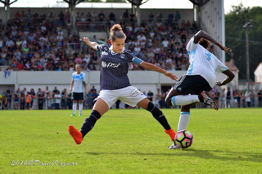 Sur le terrain la prudence aura prévalu durant les 10 premières minutes avant que les bordelaises sur leur flanc droit réussissent à déséquilibrer les marseillaises. Sophie Istillar au four et au moulin ouvrait des brèches et Andréa Lardez trouvait la capitaine Sarah Cambot qui allait faire mouche (14°). Le coup parfait pour les girondines à cet instant dans la liesse qu’on imagine pour ce premier but historique.