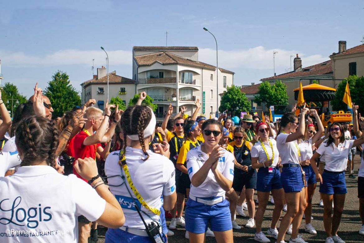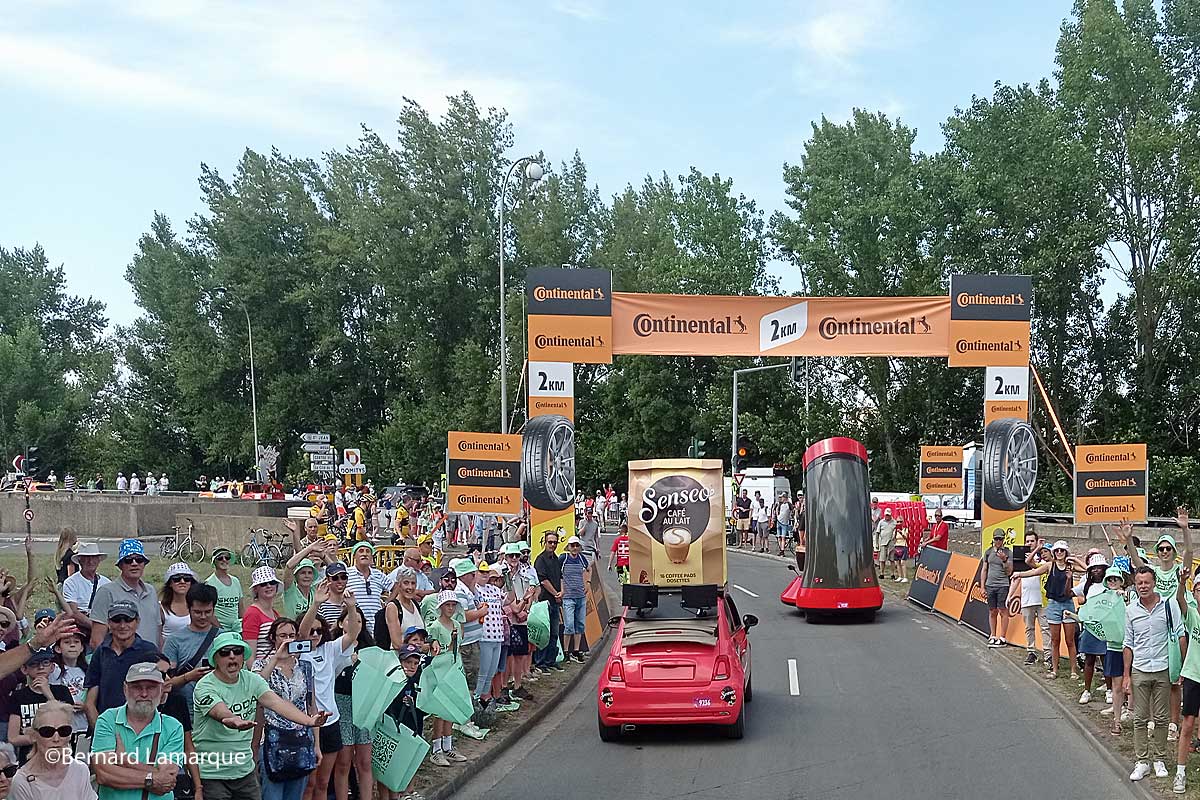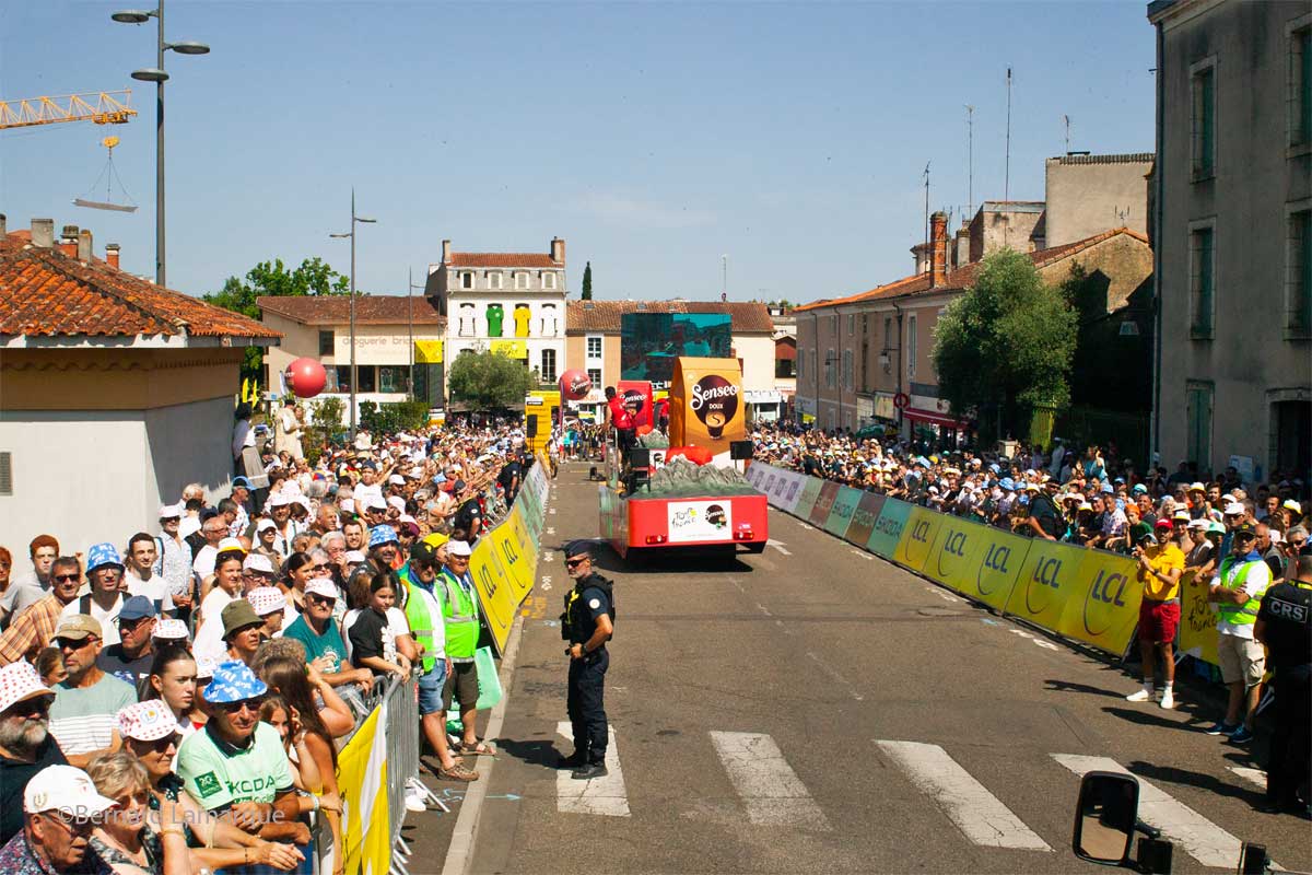 Aimablement cornaqué par Diane Bouchedor, attaché relation presse à l’arrivée du train bondé, elle nous a récupéré à la gare de Mont de Marsan, Bordeaux Gazette a rejoint la caravane soigneusement rangée dans les rues du centre de la ville, parfaitement aligné de chaque côté pour pouvoir prendre dans l’ordre, l’itinéraire de l’étape en franchissant le point de départ en premier, ouvrant ainsi la route à la course. Senseo, café officiel du Tour de France offre le café à l’ensemble des caravaniers chaque matin qui se retrouvent avant le départ pour effectuer après ce café "la danse des caravaniers" qui pendant un petit quart d’heure s’échauffent pour affronter la journée d’animations qui va déverser sa bonne humeur en avant de la course pour chauffer le public. Le rituel est très suivi chaque matin où tous se retrouvent dans la joie et la bonne humeur pour se mettre en forme car les journées sont épuisantes. Précédant le départ les caravaniers Senseo suivent un petit brief délivré par le chef caravanier Dimitri qui donne les dernières instructions pour la journée avant de passer à une formule de motivation où on se retrouve en cercle bras tendu main droite superposées pour prononcer une phrase rituélique propre à l’entreprise avant d’embarquer à bord du véhicule qui accepte du public, une plate forme avec deux tasses de deux places chacune où l’on est soumis au aléas de l’extérieur, soleil voire pluie.