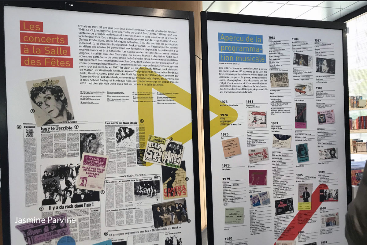 À la bibliothèque : les années 70. Accentuée sur les anecdotes musicales de la salle, on y trouve la programmation des 50 dernières années de concert. « Certains sont sûrement passés à la trappe. À l’époque les gens ne se souvenaient pas toujours de la soirée de la veille » rigole la commissaire chargée de présenter l’exposition à Alain Juppé et aux habitants, venus pour l’occasion. De plus, un fond de vinyle en lien avec le calendrier de l’époque a été mis en place. On y trouve des artistes comme The Cure, Iggy Pop, Metallica, Texas ou encore Noir Désir. L’exposition se termine à la Mairie de quartier, basée sur les années 80 et les habitants, mettant en avant un panel de documents d’archives « C’est un lieu intergénérationnel qui a, et qui va à nouveau apporter du dynamisme à Grand Parc » s’enthousiasment Claudette et Véronique habitantes du quartier.