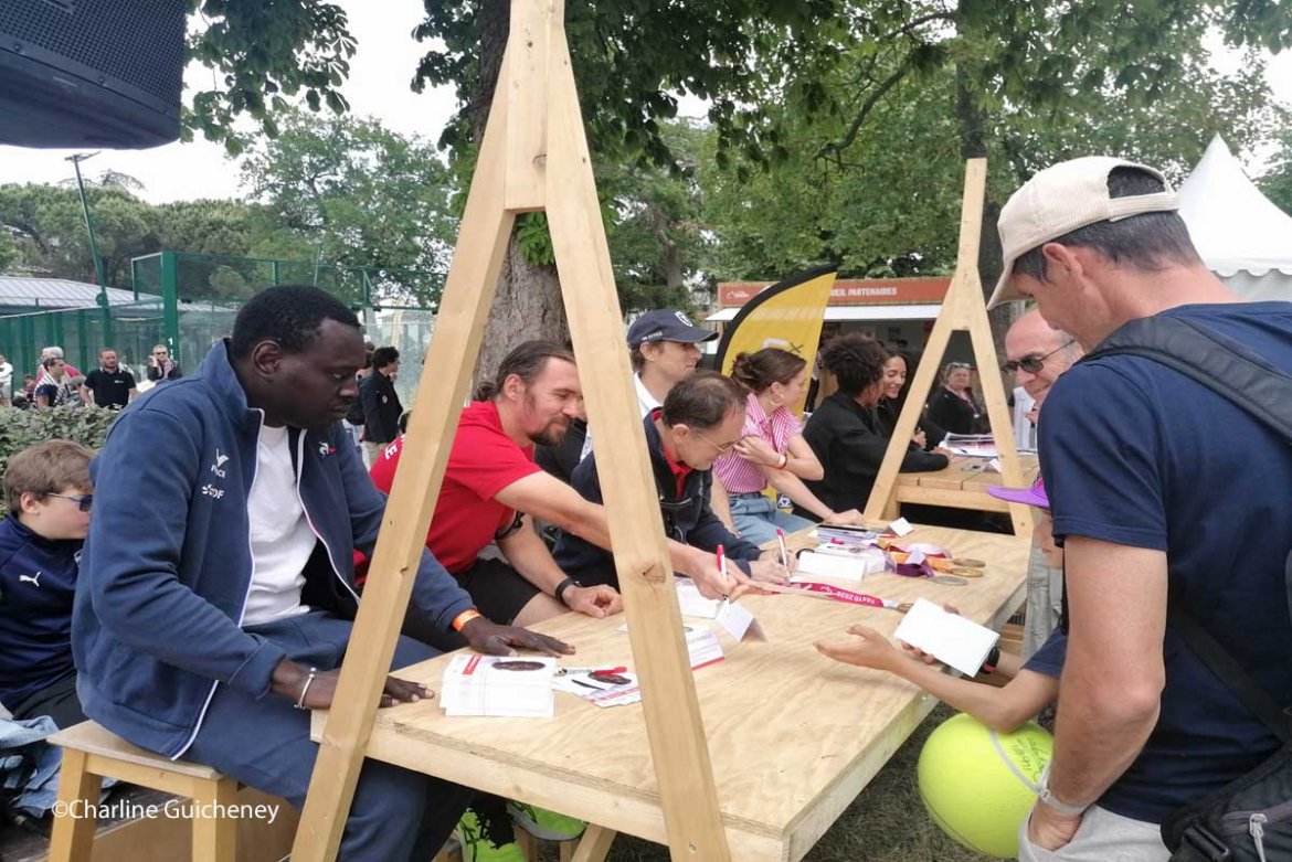 A la même occasion, des démonstrations de tennis en fauteuil roulant sur les courts d’entraînements ont rassemblé quelques curieux. Saïd Berregrague, 48 ans fait partie des trois joueurs qui étaient en fauteuil. Il pratique le tennis-fauteuil depuis maintenant 10 ans et est animateur de l’association « Fête le mur », créée par Yannick Noah. Classé 76ème en France, Saïd Berregrague a déjà participé au championnat de France. Outre le fait d’être en fauteuil, la seule différence avec le tennis est l’autorisation de deux rebonds, même si le deuxième est en dehors du terrain. Plusieurs personnes sont venues le féliciter. « C’est un grand plaisir à partager avec tout le monde ici », s’est-il enthousiasmé.