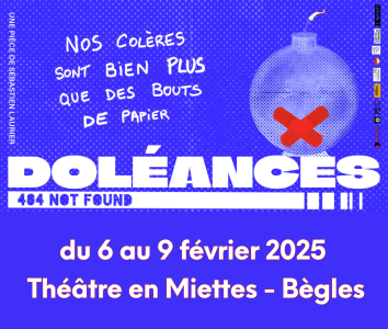 La pièce de théâtre Doléances 404 not found sera jouée prochainement le 29 Janvier à la Salle des Fêtes du Grand Parc à Bordeaux, et du 6 au 9 Février au Théâtre en Miettes à Bègles.
